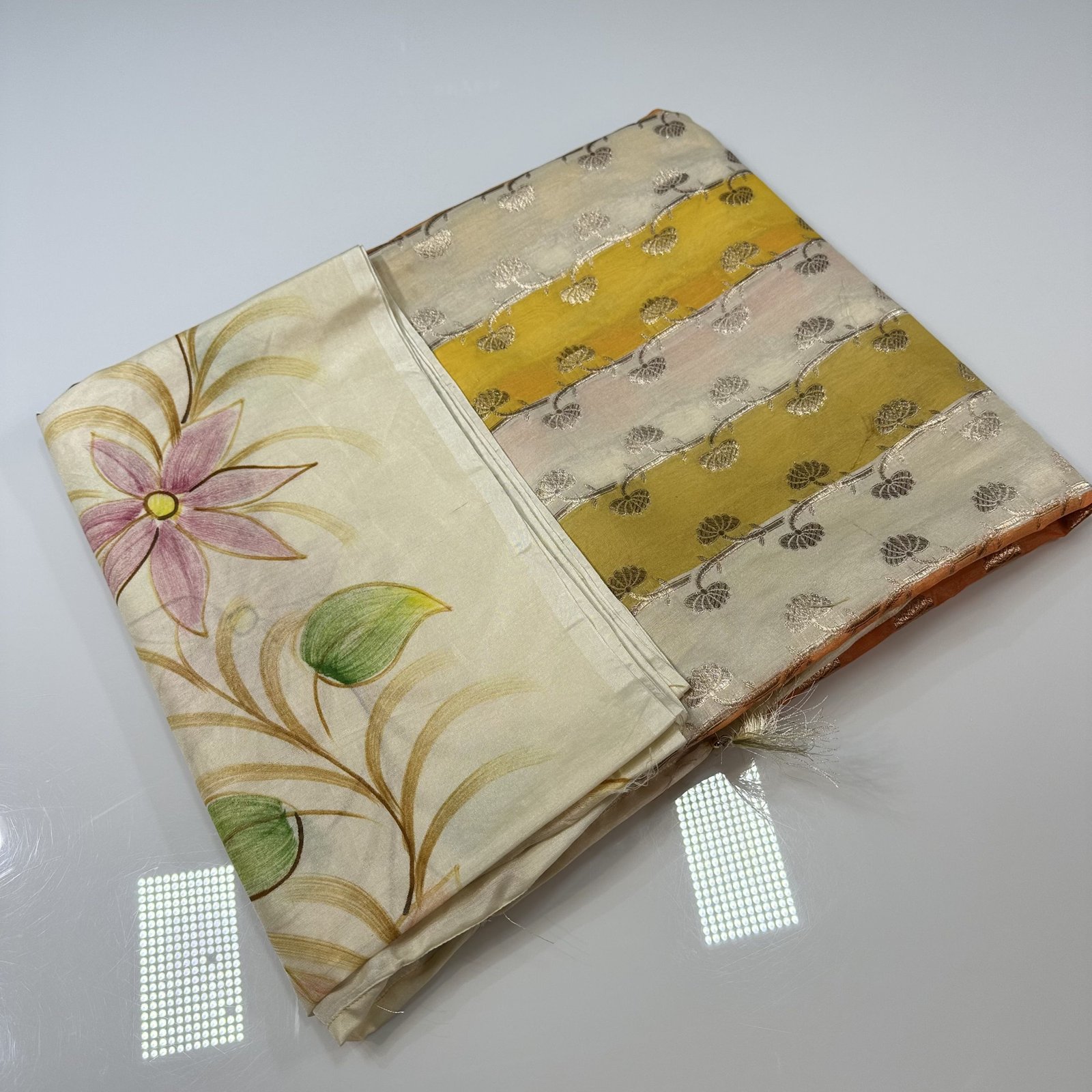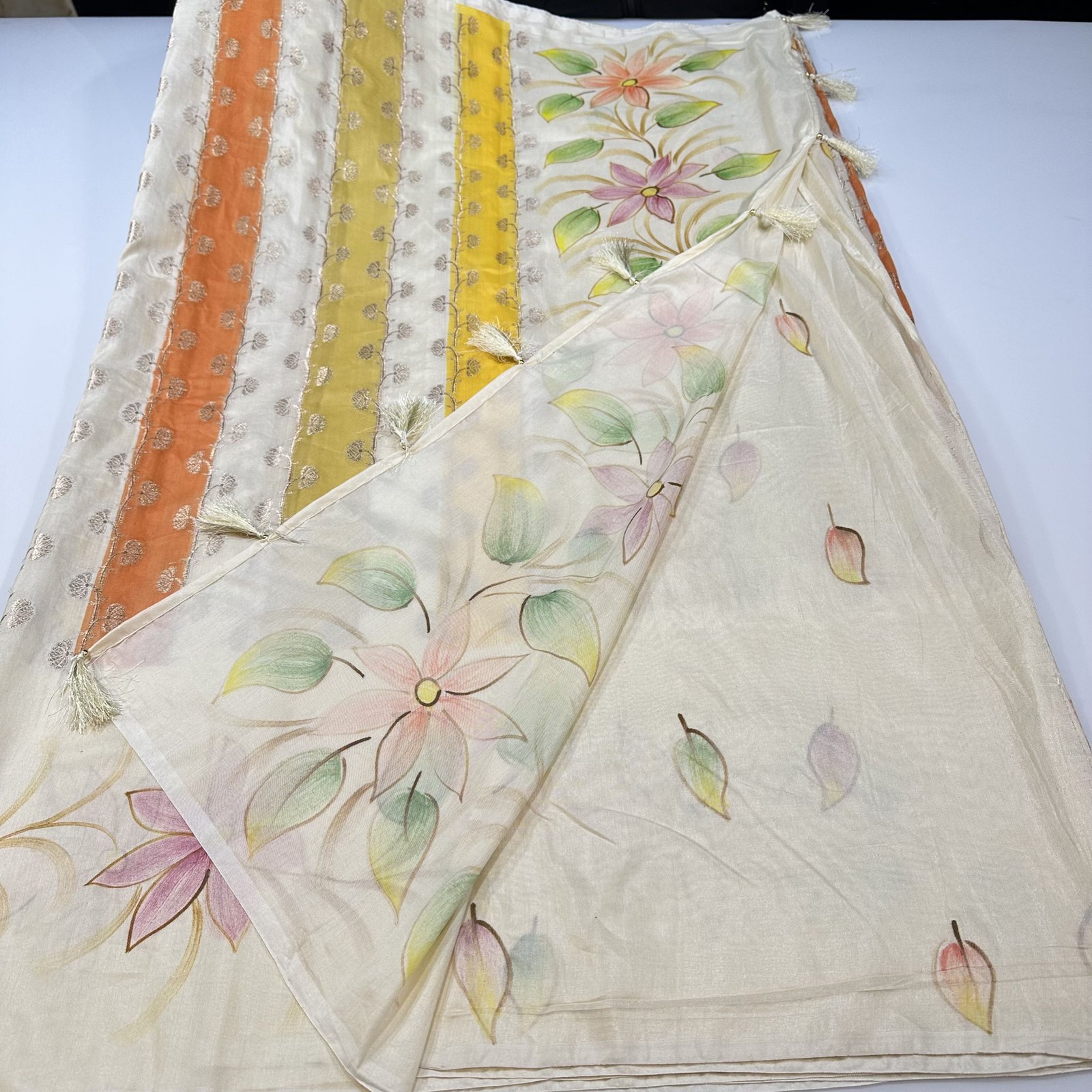 A soft Banarasi semi-silk cotton saree in a soothing cream base, beautifully adorned with hand-painted rangkat patterns created through delicate brush strokes. Floral hues flow gracefully across the body, adding an artistic and elegant charm. Lightweight and comfortable, this saree blends traditional Banarasi touch with a fresh, handcrafted appeal—perfect for effortless everyday elegance and subtle festive wear.
