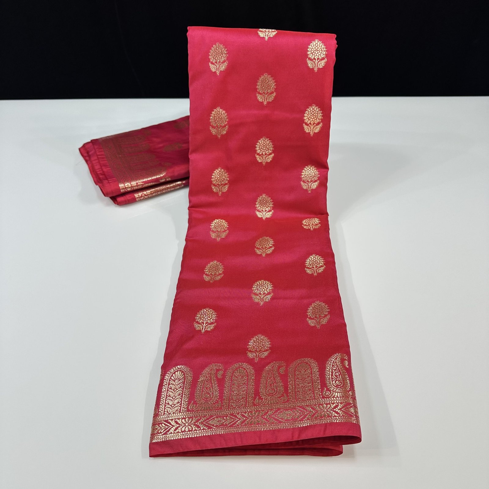 Drape yourself in timeless elegance with this soft Banarasi semi-Katan silk saree, crafted to reflect the richness of traditional Banarasi artistry ✨ The body of the saree is beautifully adorned with intricate zari weaving motifs spread gracefully all over, adding a subtle shimmer and royal charm with every movement. The fine semi-katan silk texture makes it incredibly soft, lightweight, and comfortable to carry — perfect for long celebrations without compromising on style.