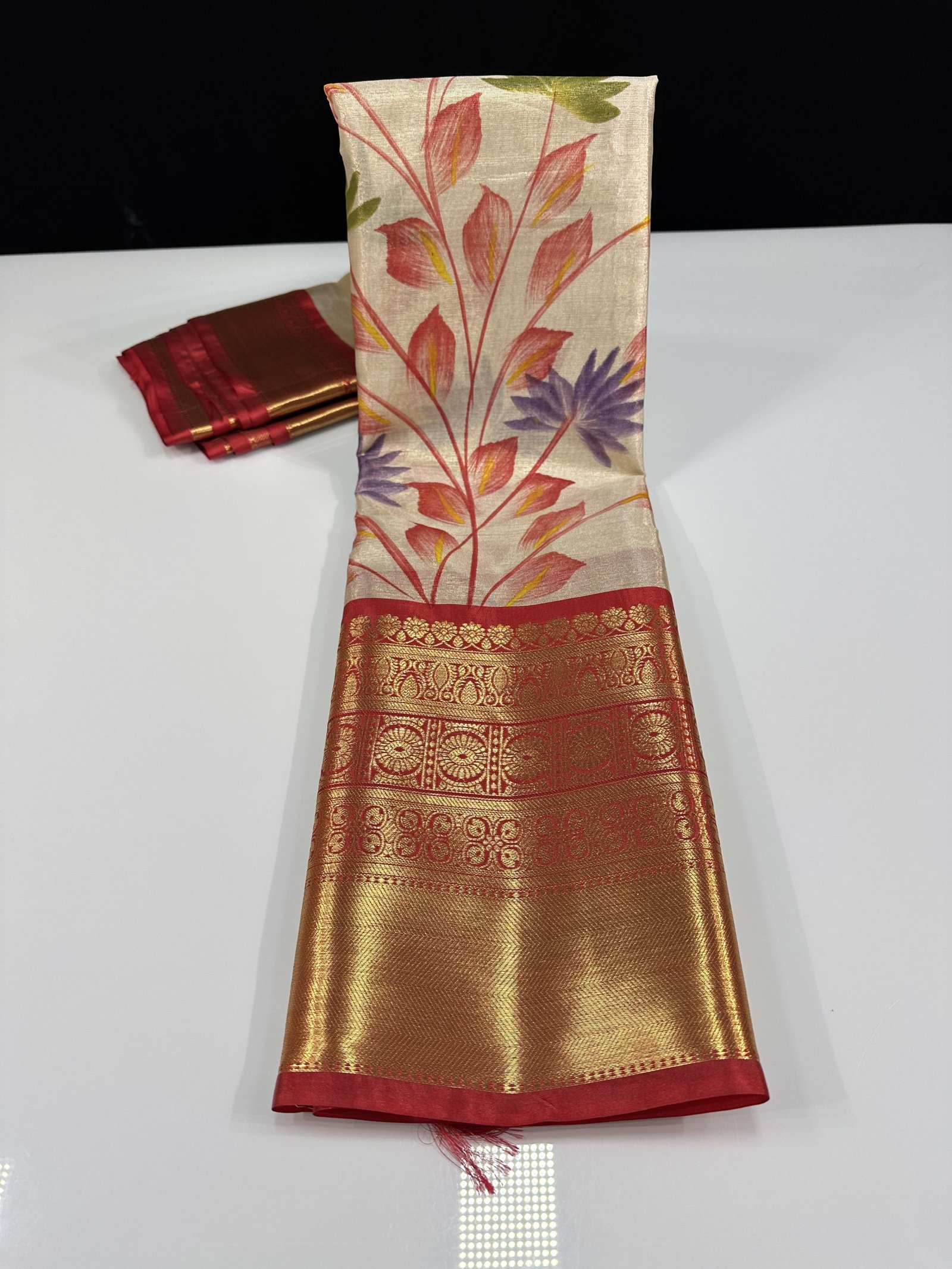 A soft and lightweight Banarasi tissue silk saree featuring an elegant hand-painted jaal pattern flowing across the body. The delicate artwork is beautifully complemented by a contrast border inspired by classic Kanchi designs, adding a refined traditional touch. Easy to drape and graceful in appeal, this saree is perfect for effortless elegance with artistic charm.