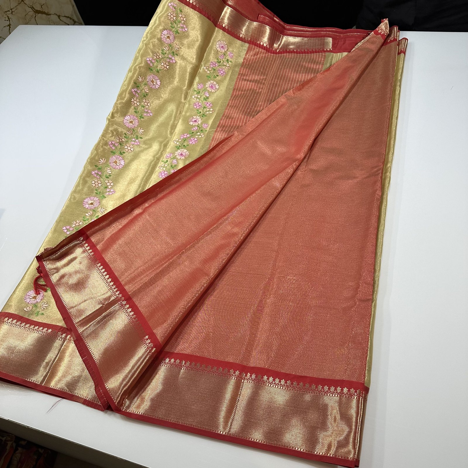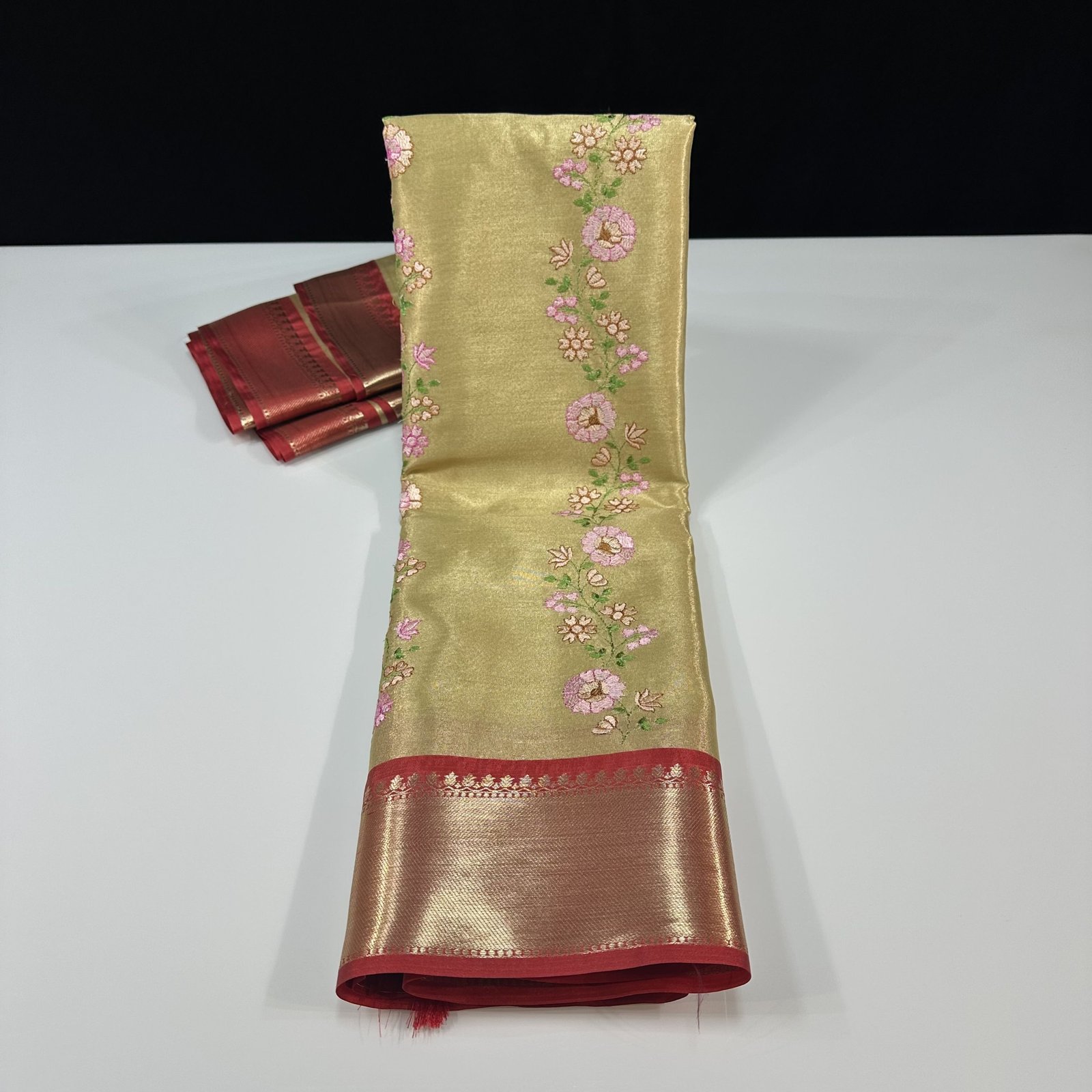 SOFT BANARASI TISSUE SILK SAREE WITH CONTRAST WEAVING SMALL ZARI BORDER WITH EMBROIDERY WORK JAAL OVER BODY