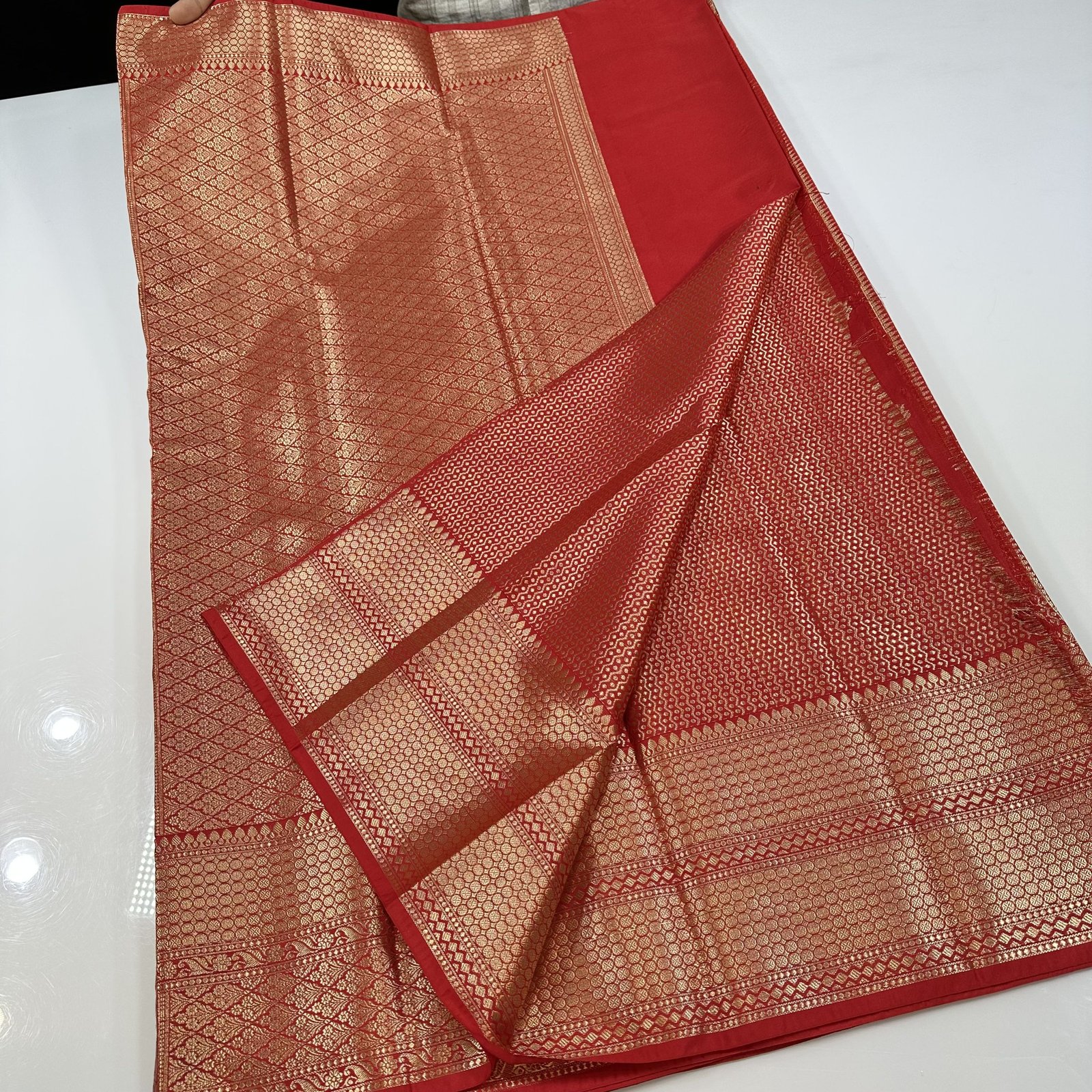 What makes this drape truly special is the delicate brush-painted floral shading inspired by Rangkat patterns, softly spread over the body of the saree. The hand-painted hues blend beautifully with the woven zari work, giving the saree a unique layered look where tradition meets artistry.