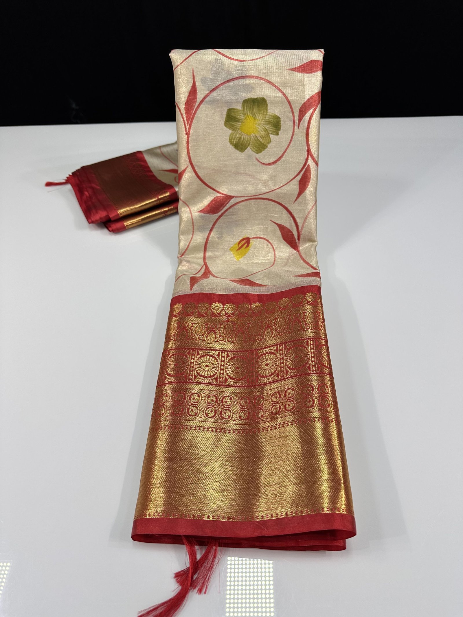 A soft and lightweight Banarasi tissue silk saree featuring an elegant hand-painted jaal pattern flowing across the body. The delicate artwork is beautifully complemented by a contrast border inspired by classic Kanchi designs, adding a refined traditional touch. Easy to drape and graceful in appeal, this saree is perfect for effortless elegance with artistic charm.