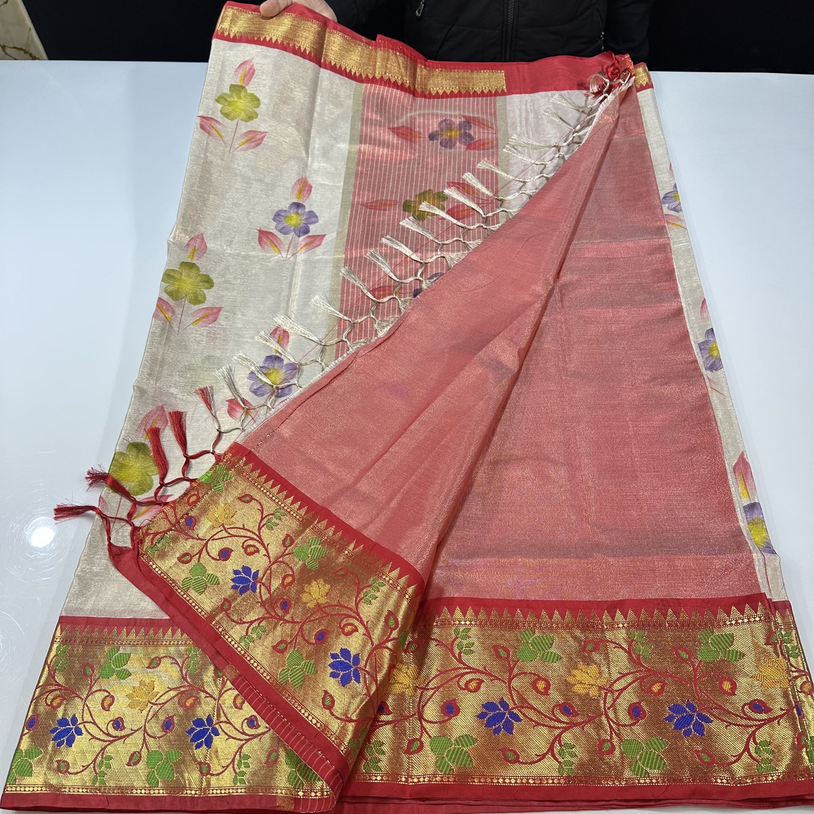 A soft Banarasi tissue silk saree in an elegant ivory shade, beautifully highlighted with hand-painted floral boota work across the body. The look is enhanced by a contrast border featuring intricate Pathani weaving, adding a refined traditional touch. Light, graceful, and easy to drape, this saree is perfect for festive occasions and timeless celebrations.