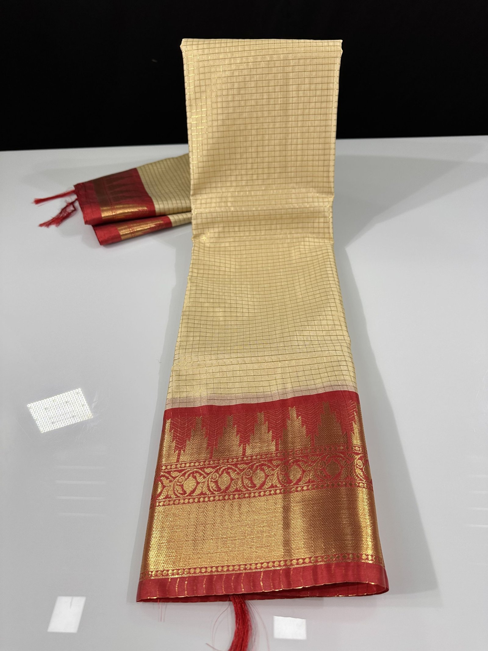 An elegant off-white saree featuring delicate checkered weaving across the body, beautifully complemented by a contrast border. The border is adorned with a classic temple design, intricately woven in rich golden zari, adding a timeless traditional charm perfect for festive and cultural occasions.