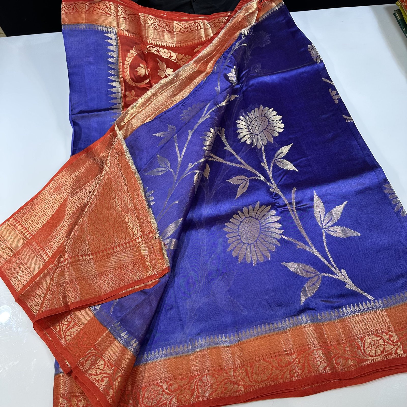 The body of the saree is adorned with intricate zari weaving jaal spread beautifully all over, creating a mesmerizing pattern that reflects true Banarasi craftsmanship. The vibrant shades enhance the detailing of the jaal work, making the saree look regal yet lively.