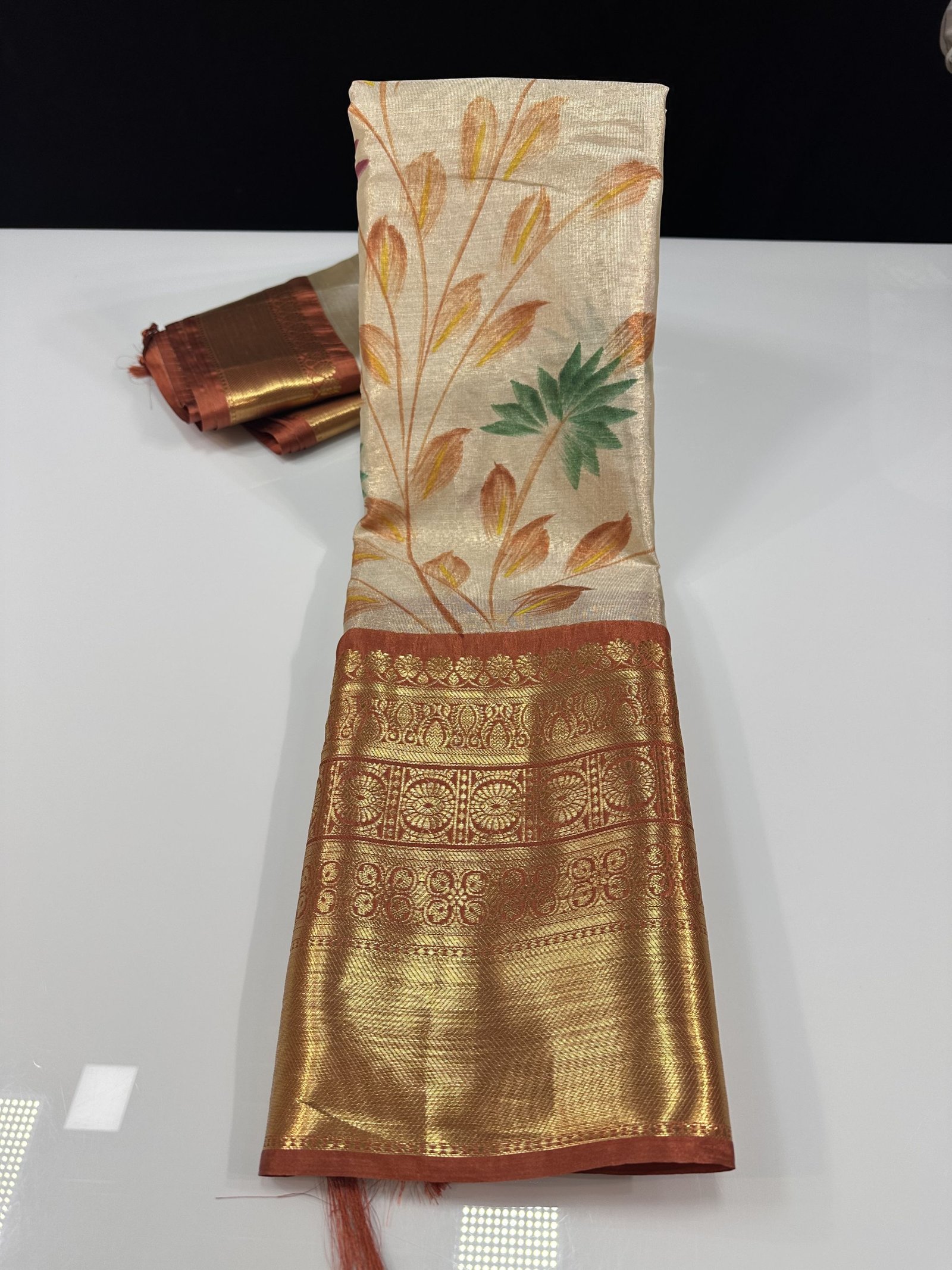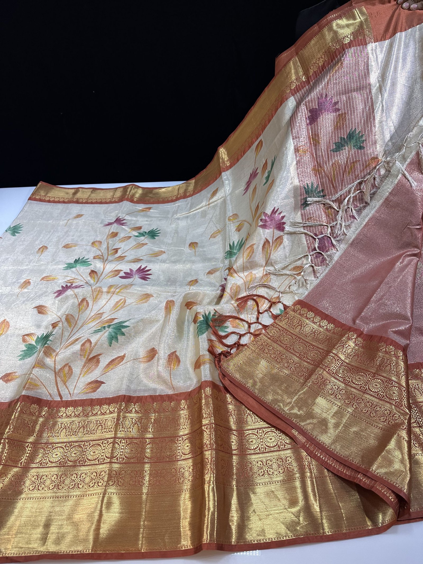A soft and lightweight Banarasi tissue silk saree featuring an elegant hand-painted jaal pattern flowing across the body. The delicate artwork is beautifully complemented by a contrast border inspired by classic Kanchi designs, adding a refined traditional touch. Easy to drape and graceful in appeal, this saree is perfect for effortless elegance with artistic charm.