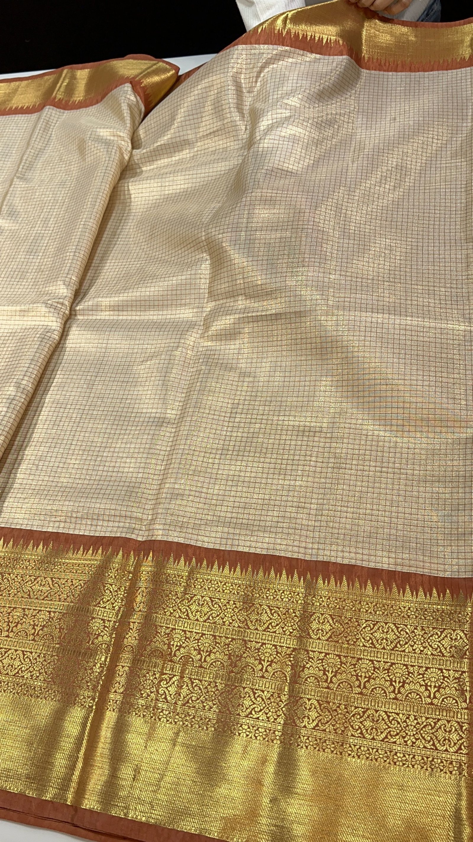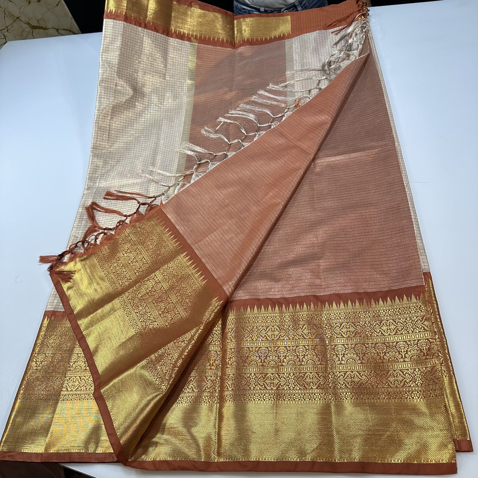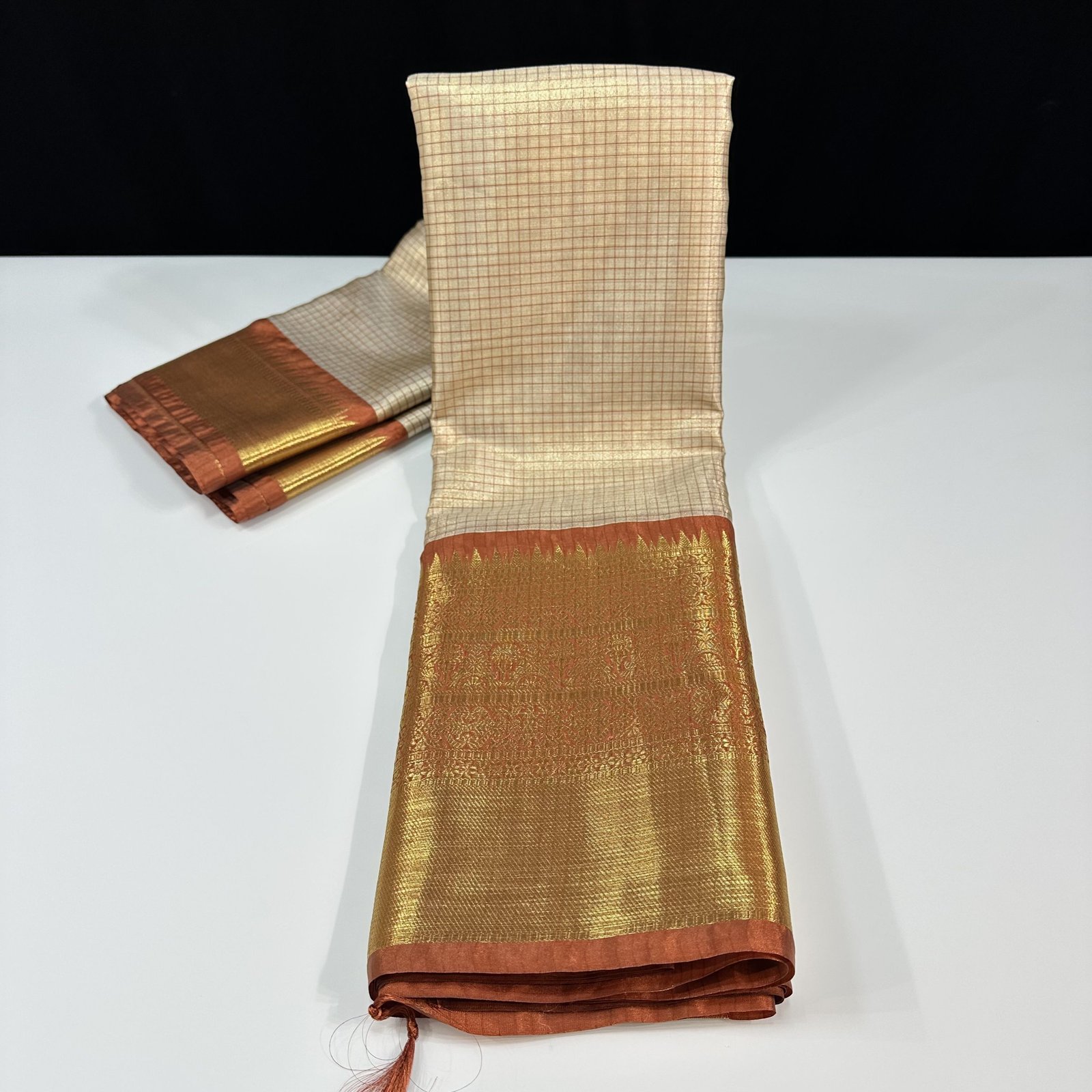 Experience sheer elegance with this Banarasi Tissue Silk Saree, gracefully adorned with resham-woven checks spread evenly across the body. The luminous tissue silk fabric lends a soft, airy texture with a subtle metallic sheen, creating a refined and graceful drape that feels as luxurious as it looks.