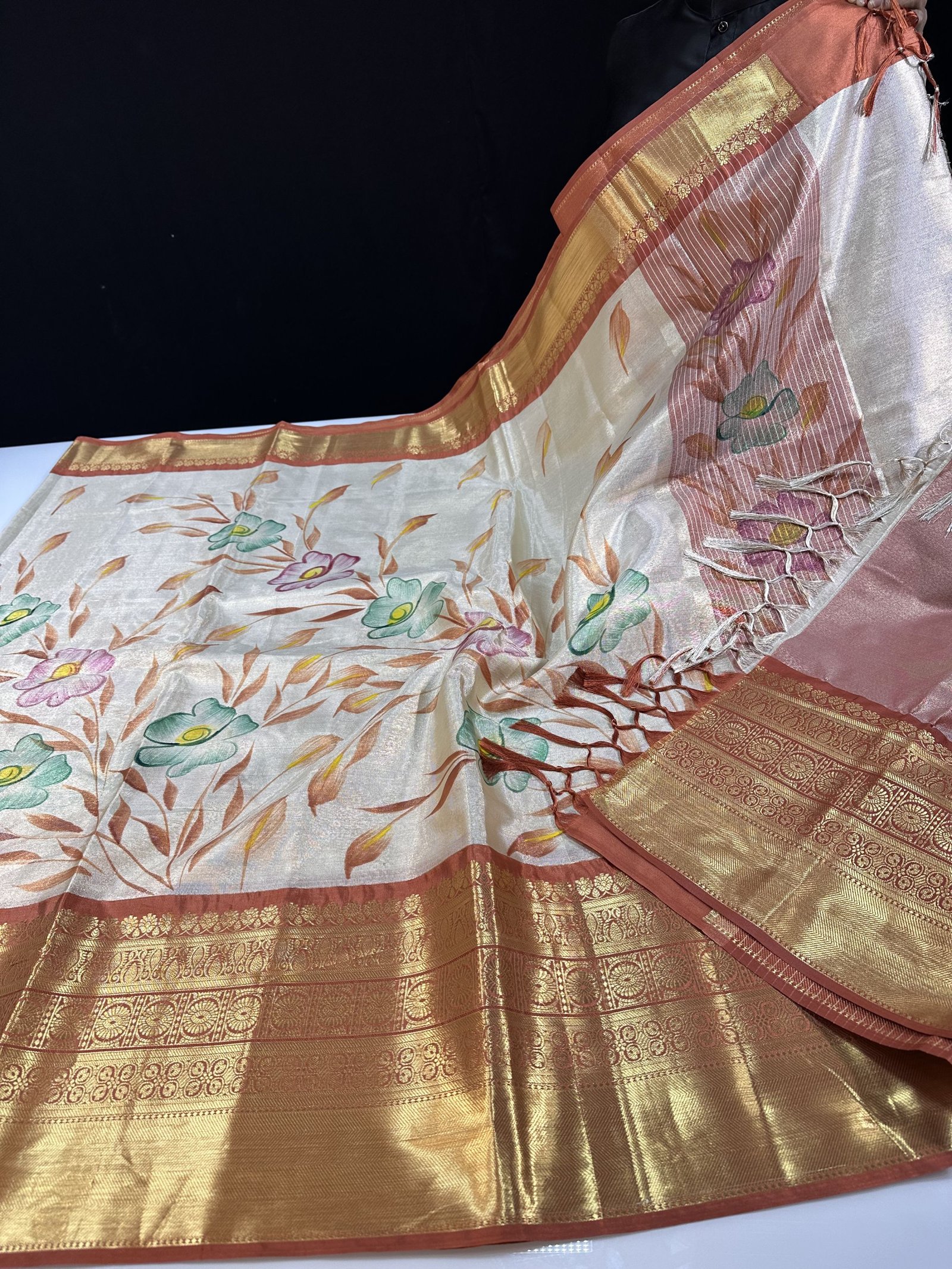 A soft and lightweight Banarasi tissue silk saree featuring an elegant hand-painted jaal pattern flowing across the body. The delicate artwork is beautifully complemented by a contrast border inspired by classic Kanchi designs, adding a refined traditional touch. Easy to drape and graceful in appeal, this saree is perfect for effortless elegance with artistic charm.