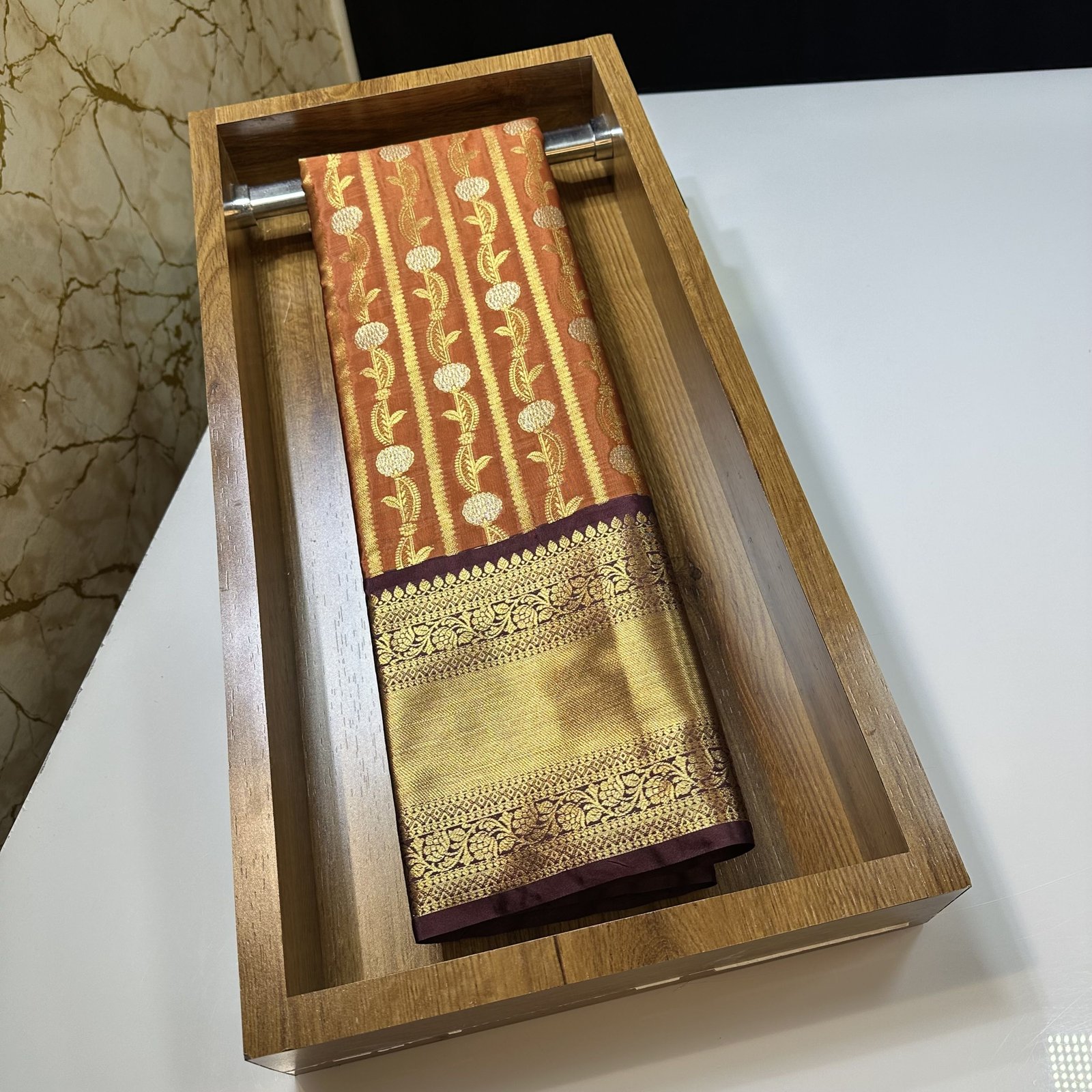 This premium soft Banarasi semi-silk brocade saree is a true expression of rich craftsmanship and timeless elegance. The body of the saree is adorned with an all-over Meenakari jaal pattern, intricately woven to create a vibrant yet refined surface that reflects classic Banarasi artistry.