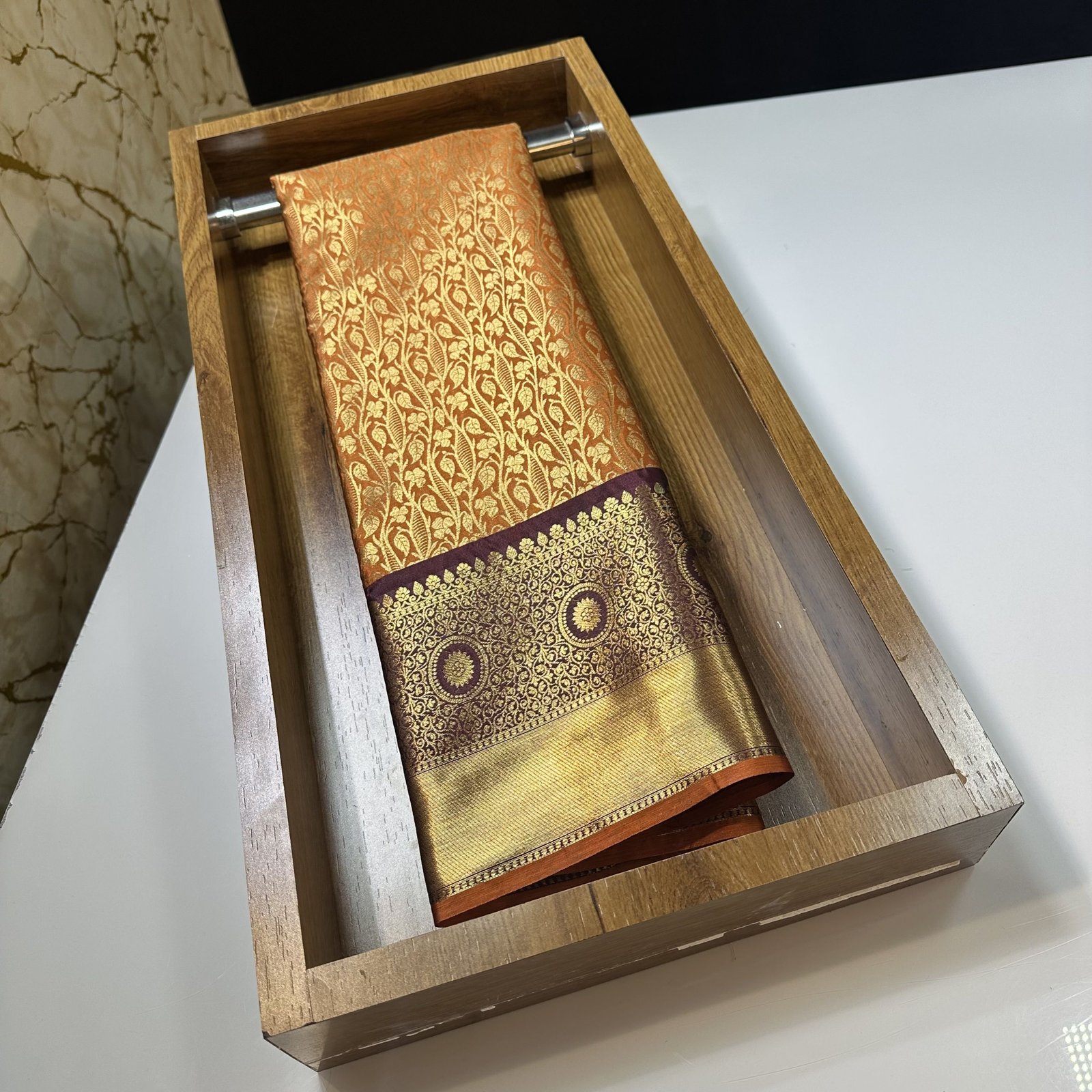 Gracefully blending tradition with thoughtful design innovation, this soft Banarasi semi-silk brocade saree is crafted for refined festive and ceremonial wear. The fabric carries a gentle sheen with a smooth, comfortable drape, making it ideal for long celebrations while maintaining the richness of Banarasi brocade artistry.