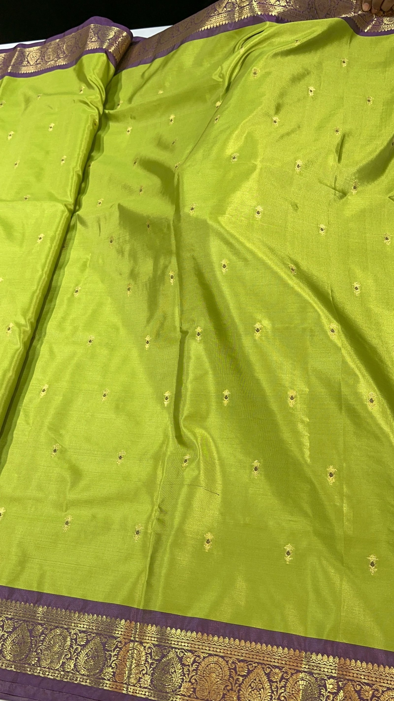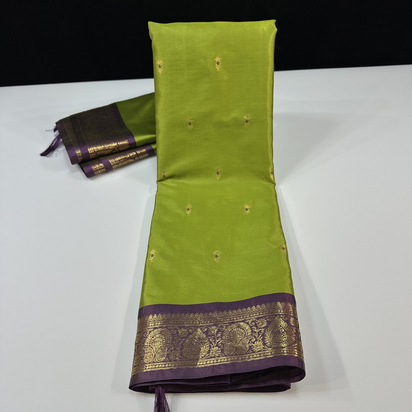 This soft Banarasi semi-silk saree is a beautiful blend of comfort and tradition, crafted with an exceptionally smooth and lightweight texture that drapes effortlessly. The body of the saree is adorned with delicate traditional zari-woven booties, each booti enriched with fine Meena work done in resham, adding subtle color highlights that bring the design to life. The interplay of shimmering zari and soft resham Meena creates a graceful, timeless charm across the saree.
