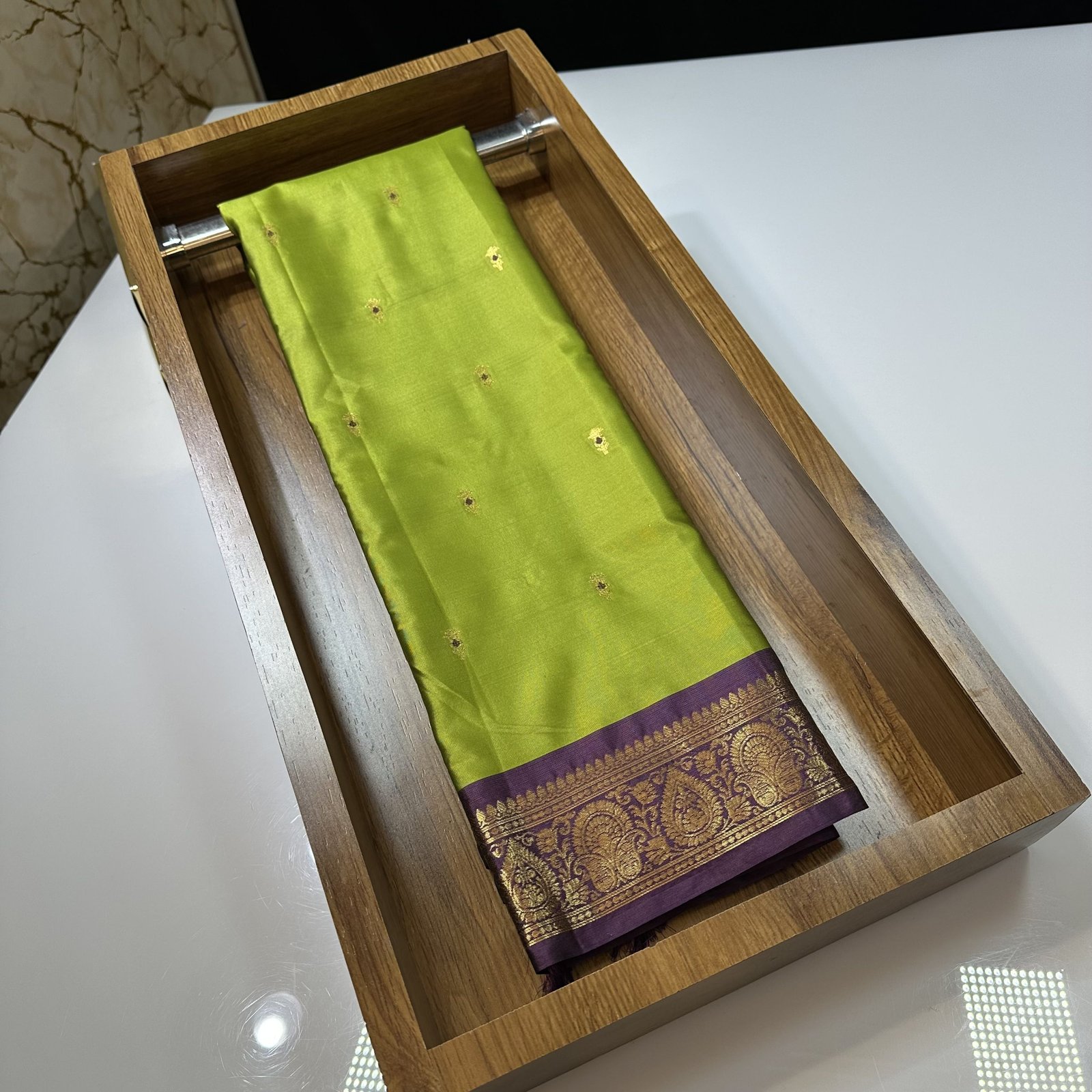 This soft Banarasi semi-silk saree is a beautiful blend of comfort and tradition, crafted with an exceptionally smooth and lightweight texture that drapes effortlessly. The body of the saree is adorned with delicate traditional zari-woven booties, each booti enriched with fine Meena work done in resham, adding subtle color highlights that bring the design to life. The interplay of shimmering zari and soft resham Meena creates a graceful, timeless charm across the saree.