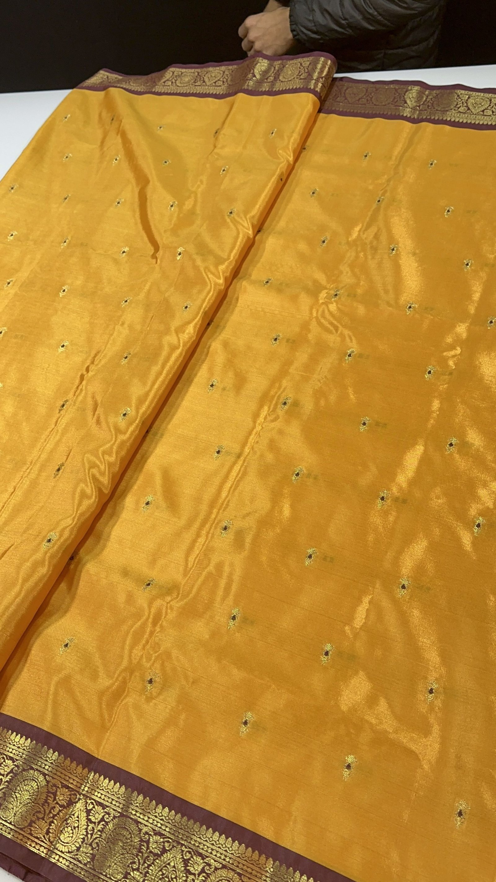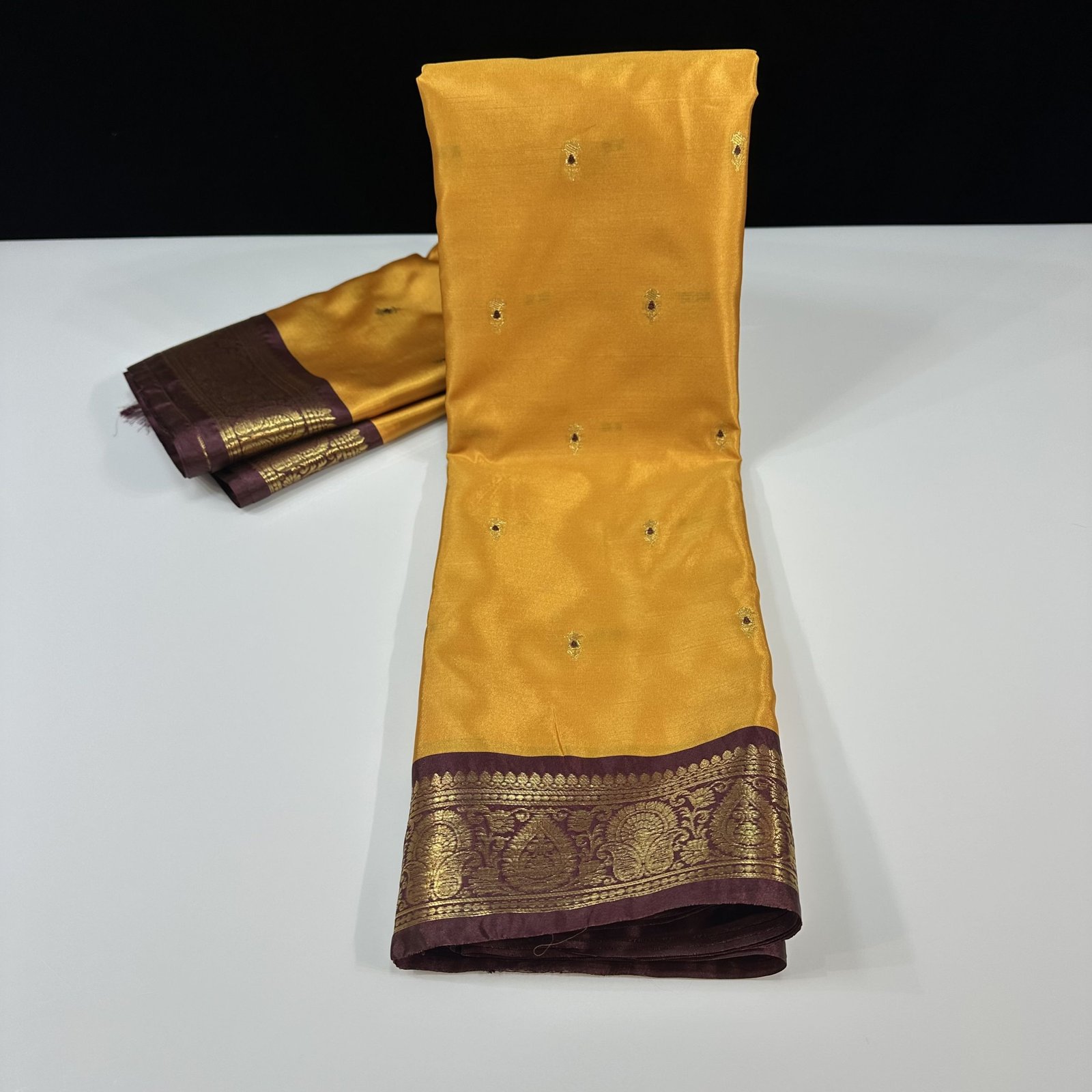 This soft Banarasi semi-silk saree is a beautiful blend of comfort and tradition, crafted with an exceptionally smooth and lightweight texture that drapes effortlessly. The body of the saree is adorned with delicate traditional zari-woven booties, each booti enriched with fine Meena work done in resham, adding subtle color highlights that bring the design to life. The interplay of shimmering zari and soft resham Meena creates a graceful, timeless charm across the saree.
