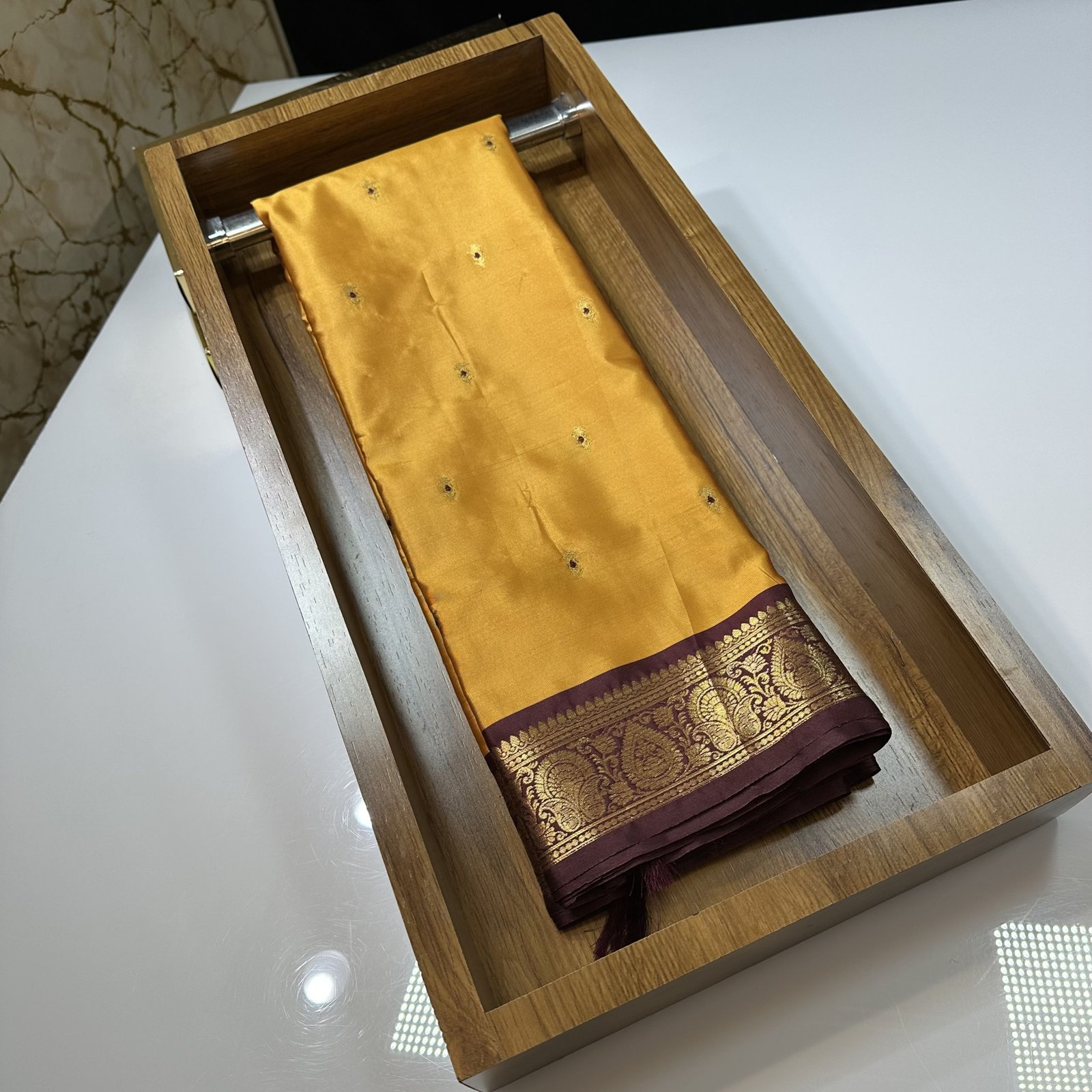 This soft Banarasi semi-silk saree is a beautiful blend of comfort and tradition, crafted with an exceptionally smooth and lightweight texture that drapes effortlessly. The body of the saree is adorned with delicate traditional zari-woven booties, each booti enriched with fine Meena work done in resham, adding subtle color highlights that bring the design to life. The interplay of shimmering zari and soft resham Meena creates a graceful, timeless charm across the saree.