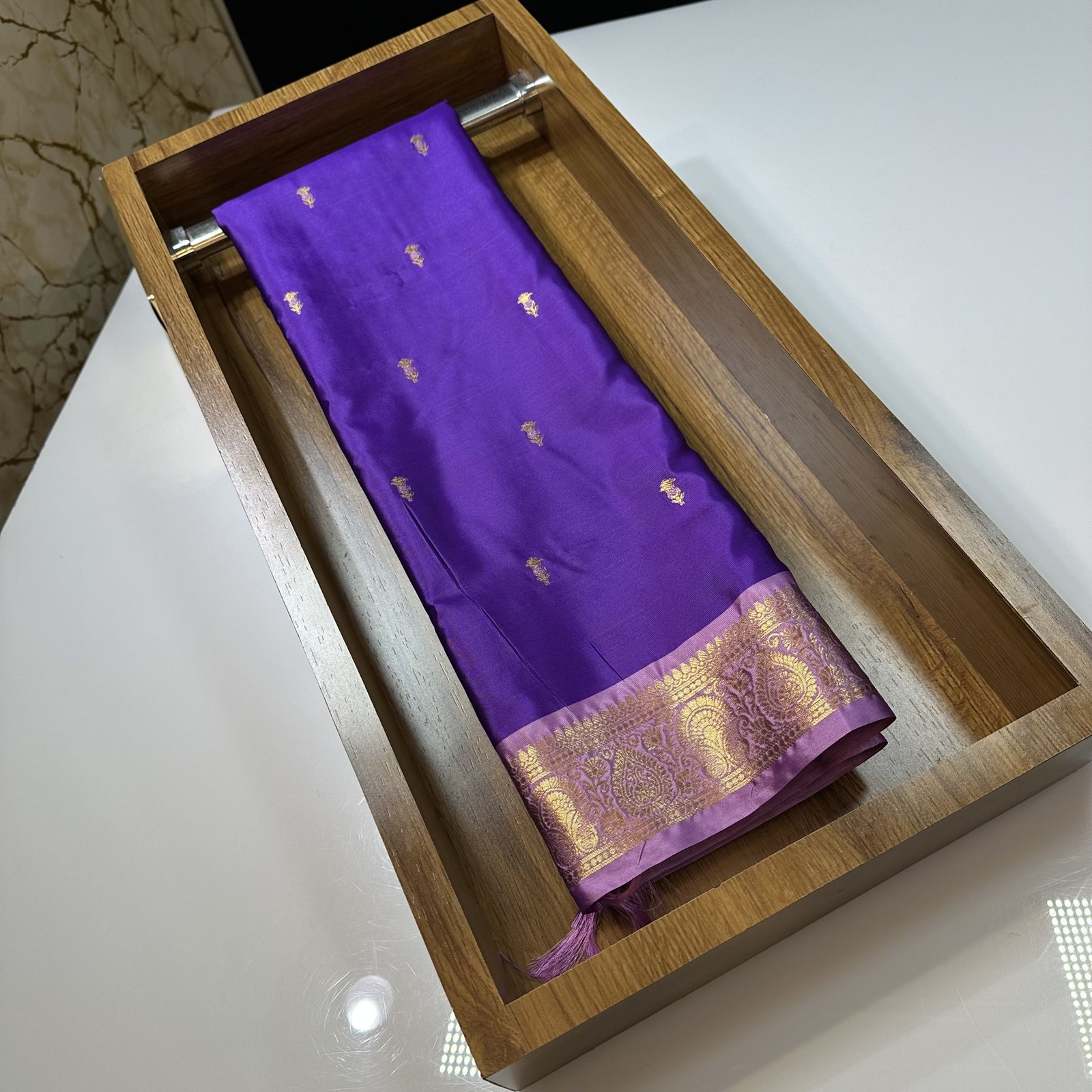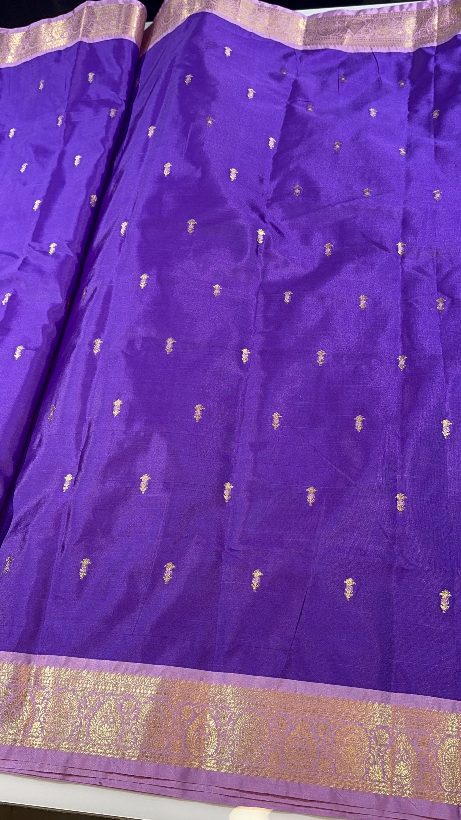 A soft and ultra-lightweight Banarasi semi-silk sari crafted for effortless drape and a graceful, body-hugging fall. The rich bright violet body is adorned with delicate zari-woven Vinagari motifs, adding a subtle traditional charm. Finished with a very fine, contrast-woven border in a soothing light lavender shade, this sari blends elegance, comfort, and timeless Banarasi artistry—perfect for all-day wear with a refined look.