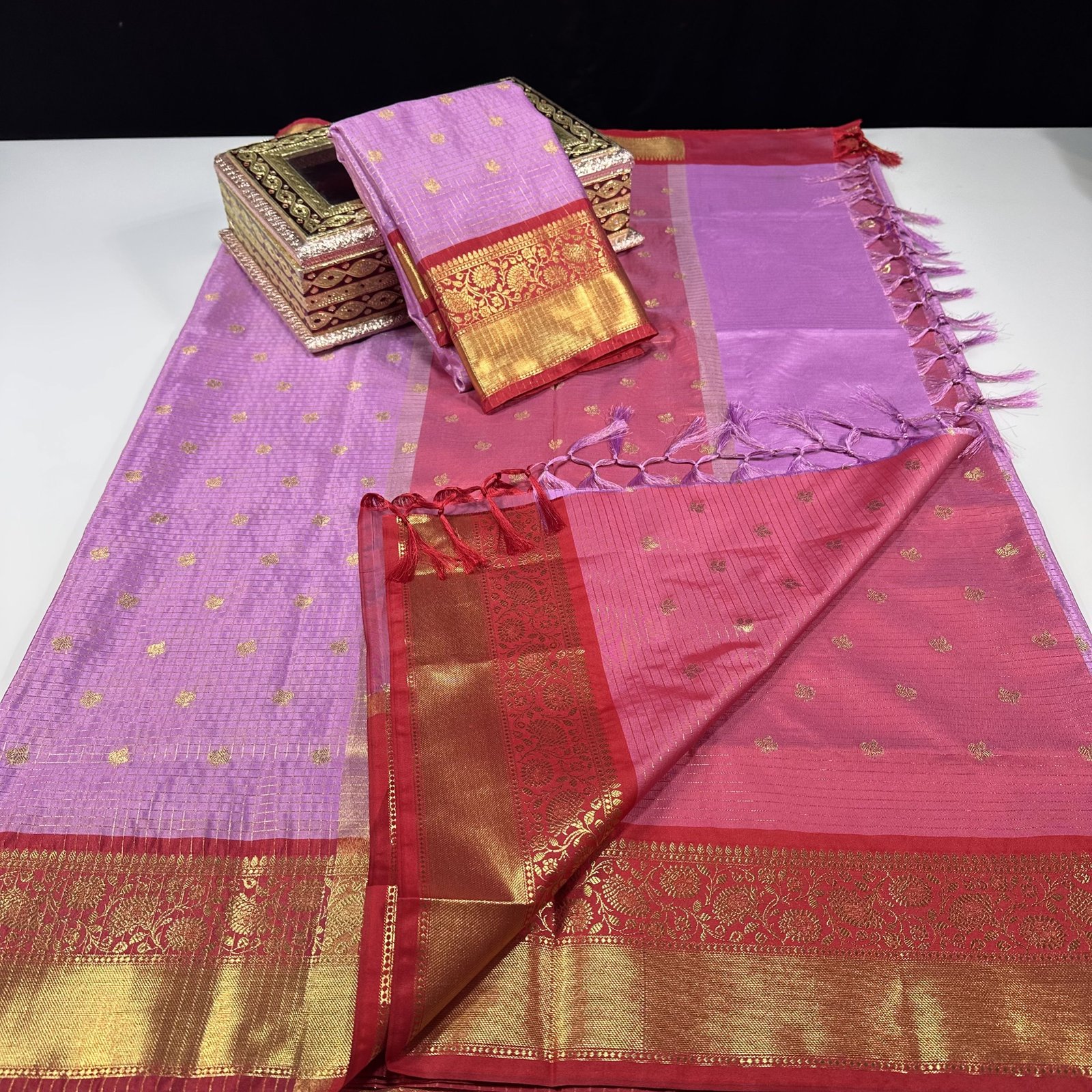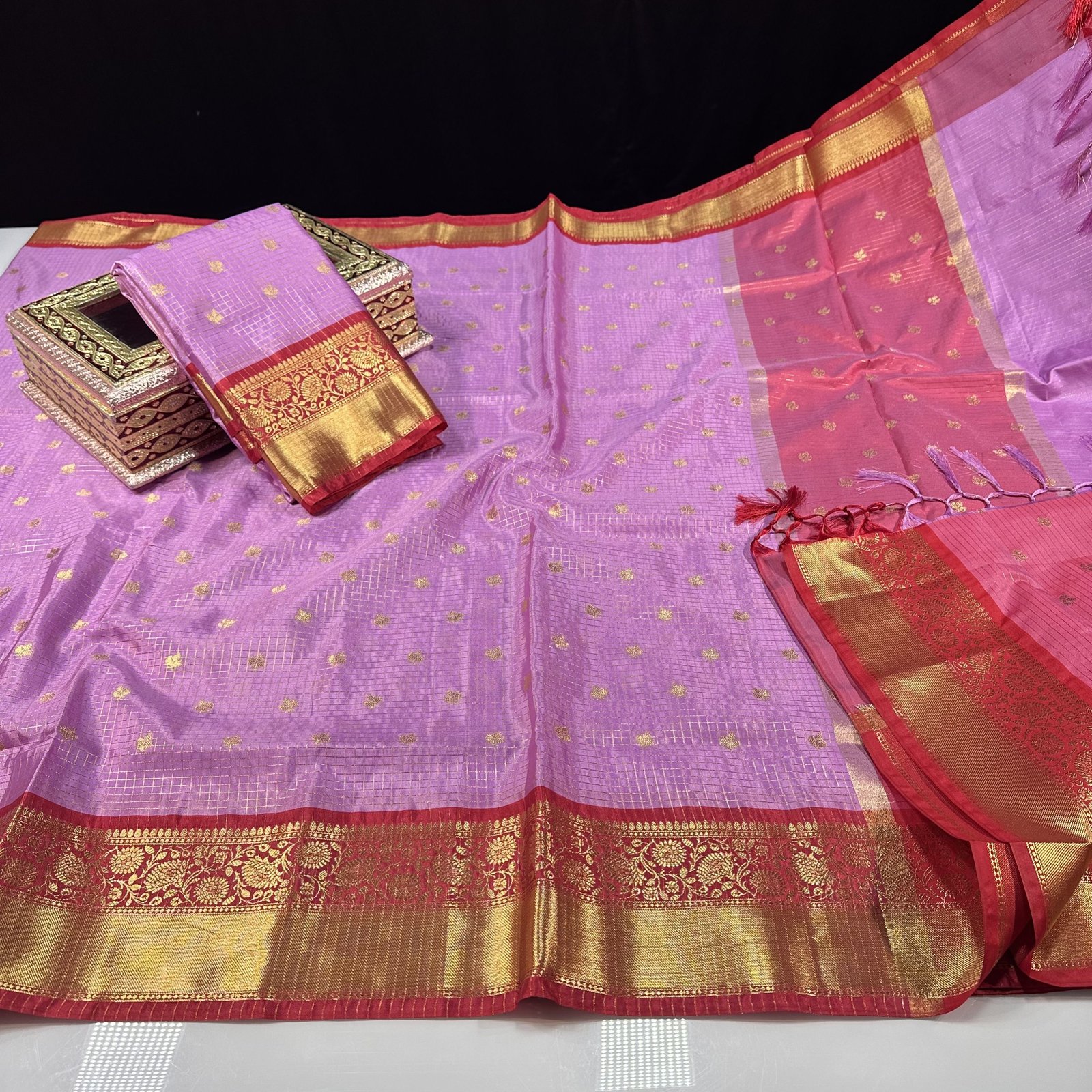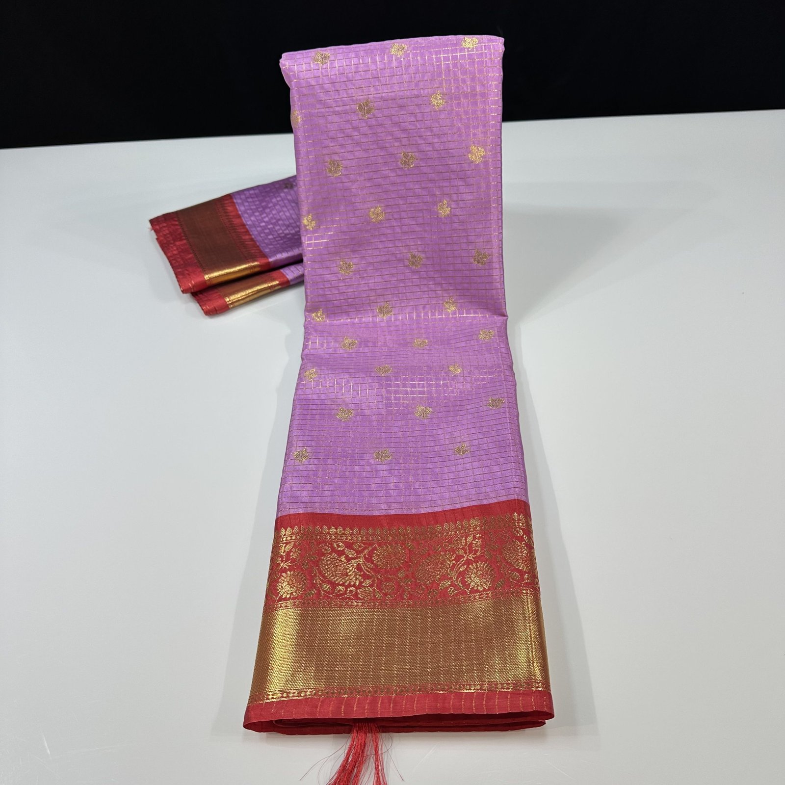 Best selling semi-Gadwal inspired checks saree in lavender shade with red shade weaving border