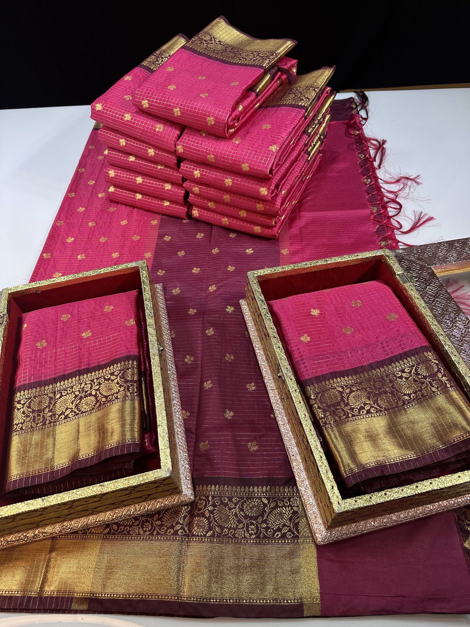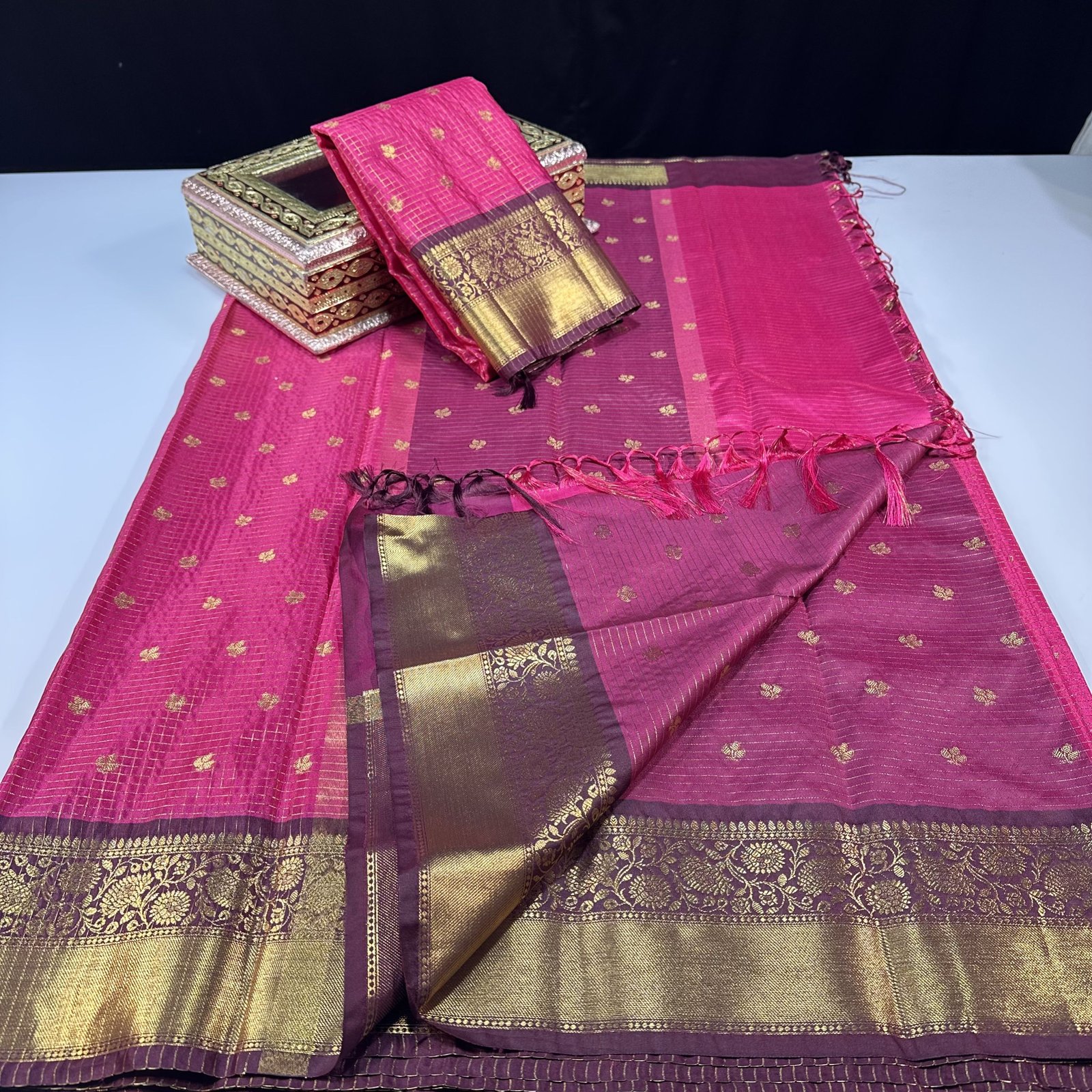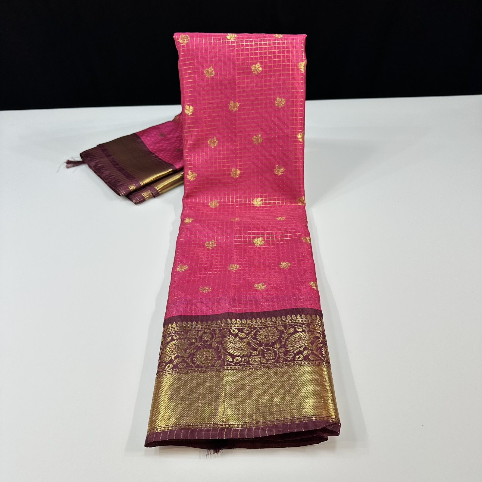 Soft semi-Gadwal checks saree in Rani shade with contrast weaving deep maroon border