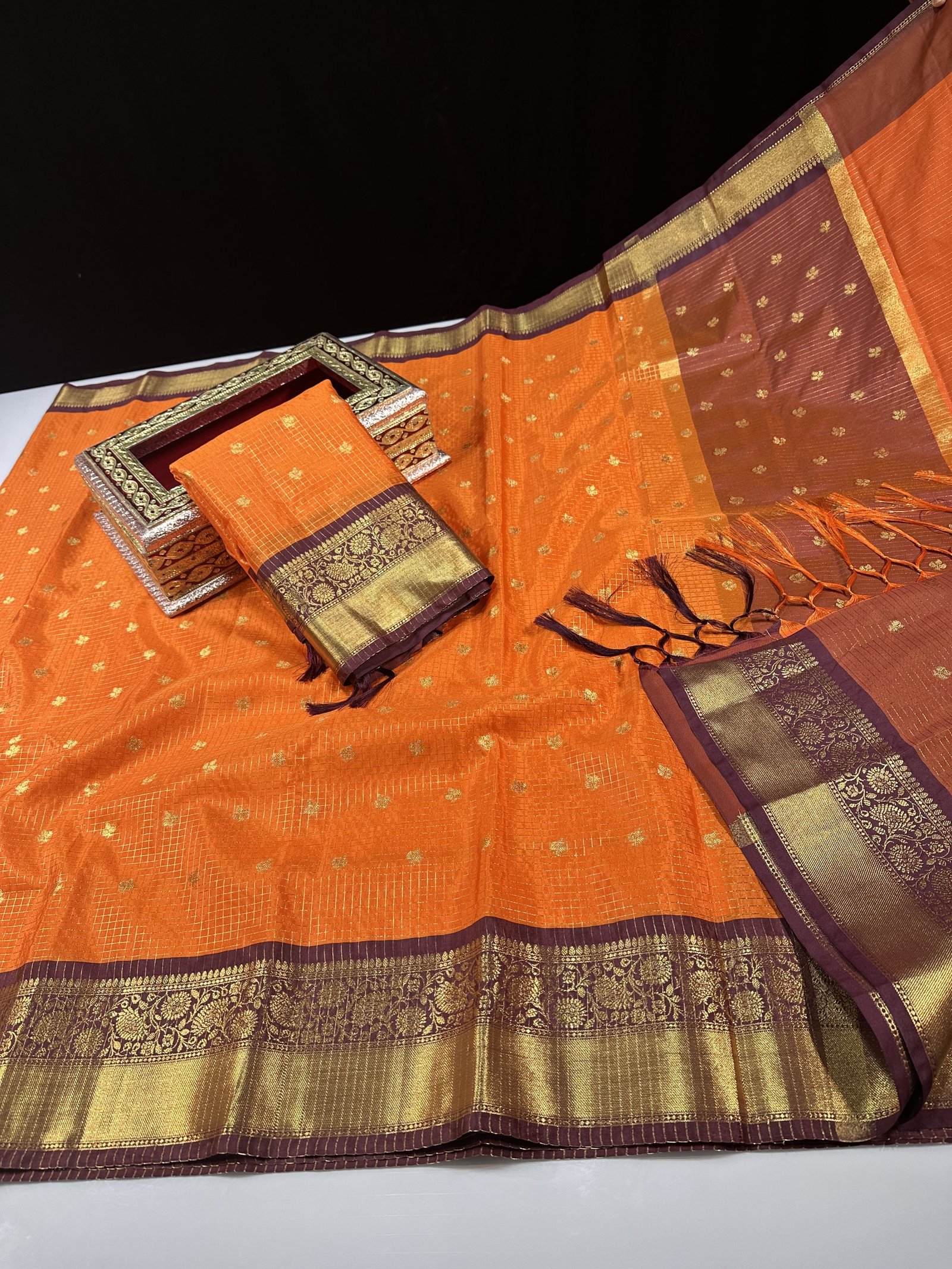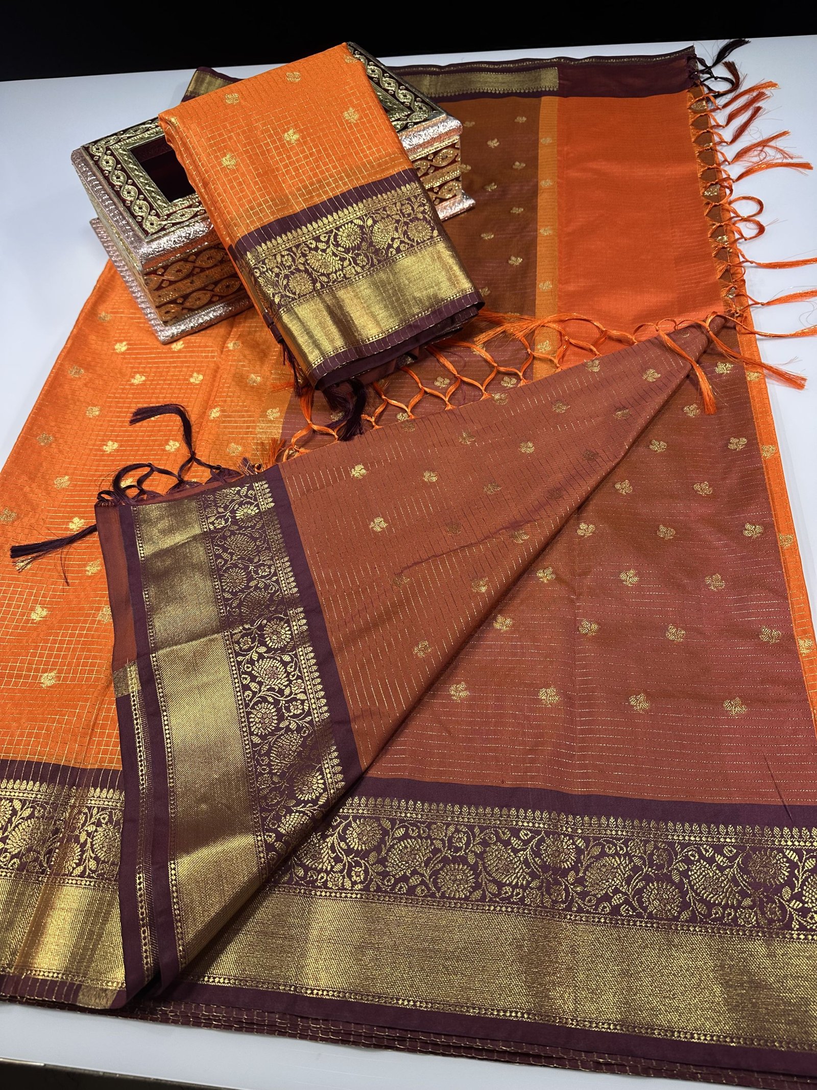Orange shade semi-Gadwal saree with contrast weaving border