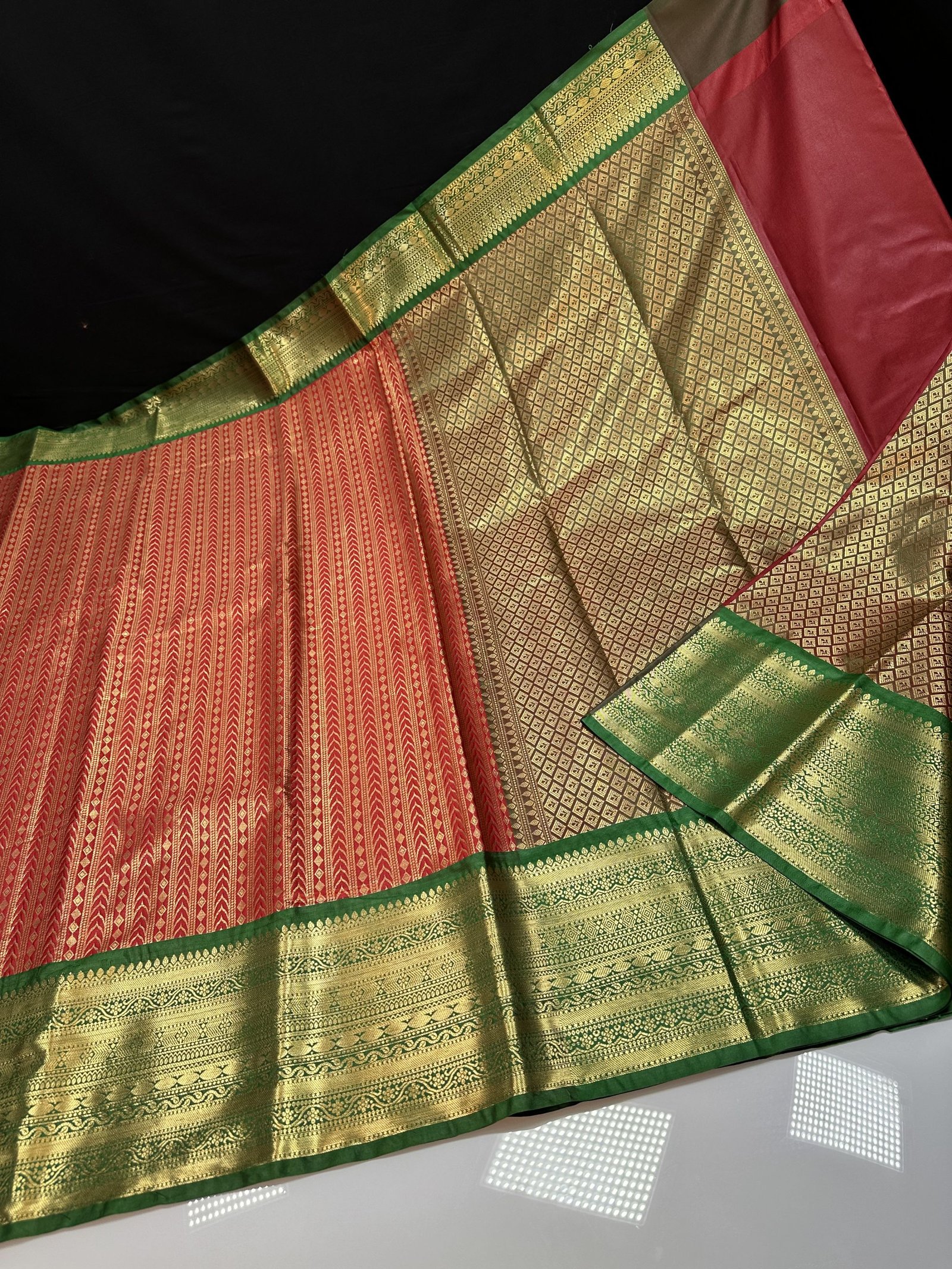 SOFT SEMI-KANCHI BROCADE SAREE IN RED SHADE WITH CONTRAST WEAVING GREEN KANCHI BORDER