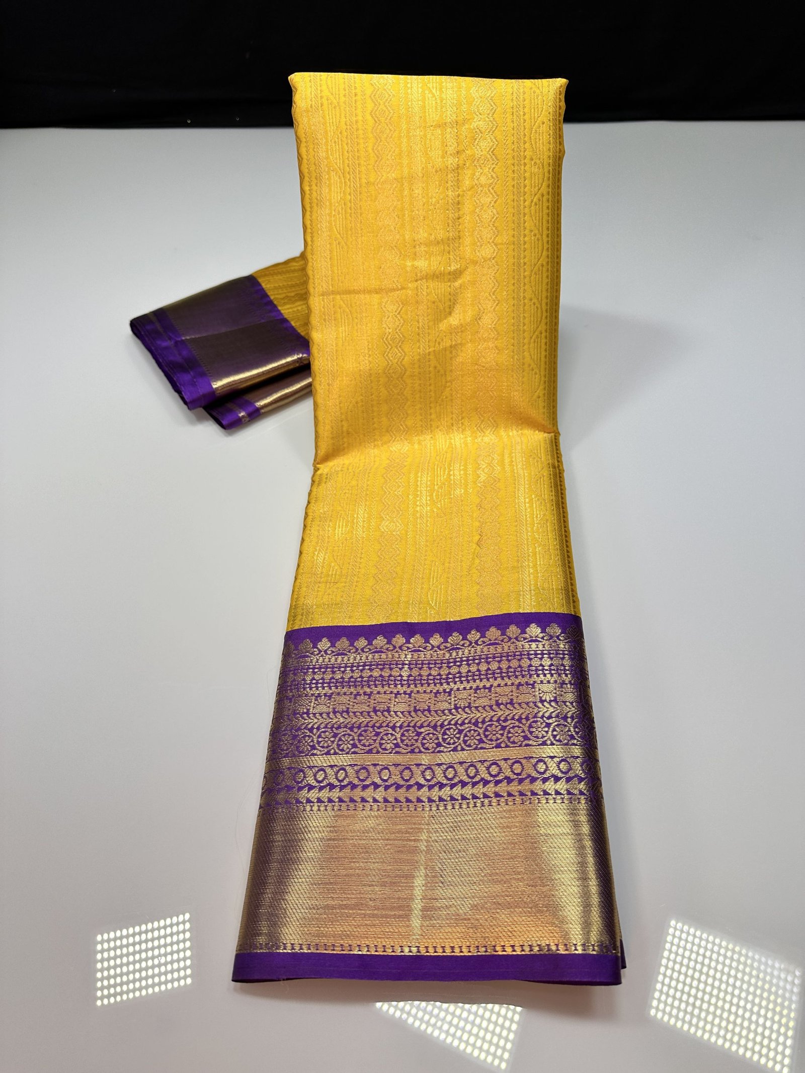 SOFT SEMI-KANCHI BROCADE SAREE IN YELLOW SHADE WITH CONTRAST WEAVING KANCHI BORDER