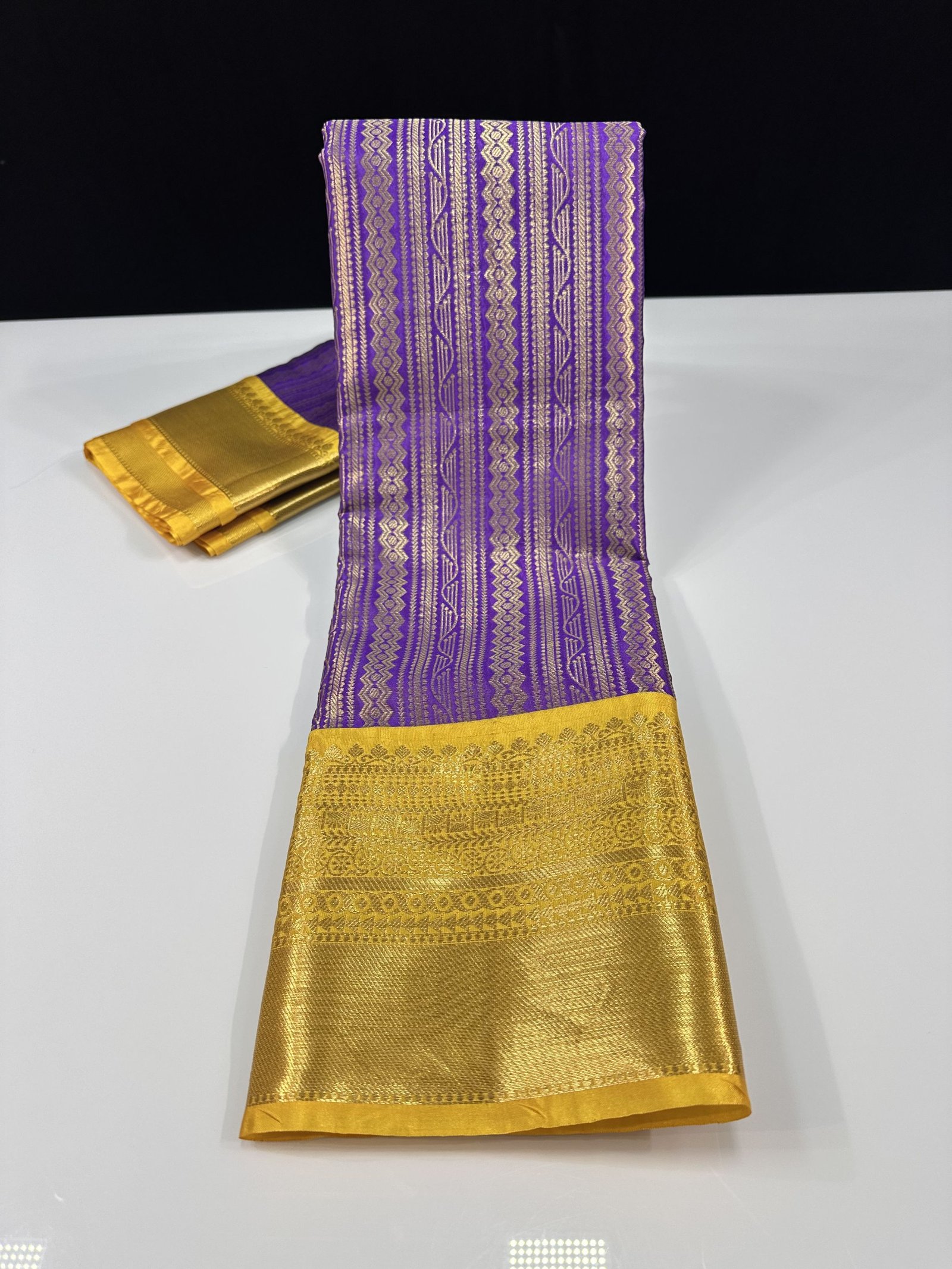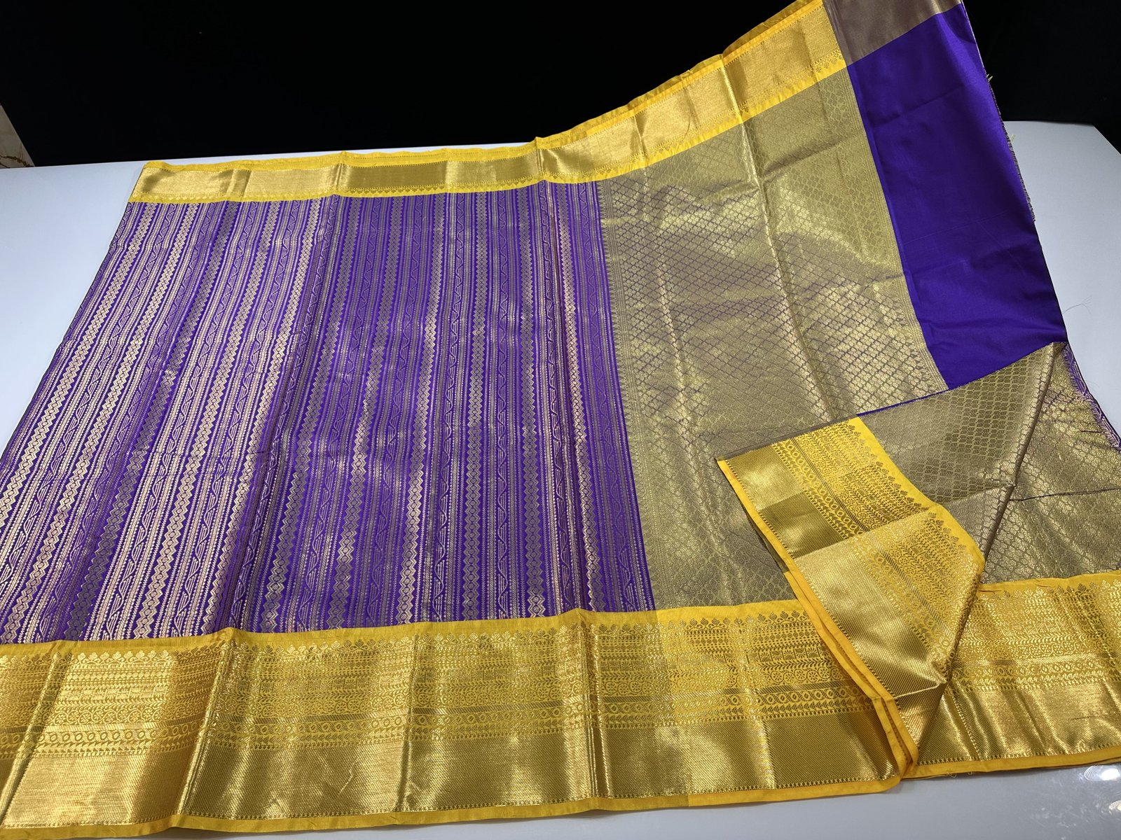 THE BEST SELLING SOFT SEMI-KANCHI BROCADE SAREE IN VIOLET SHADE WITH CONTRAST WEAVING YELLOW SHADE KANCHI BORDER