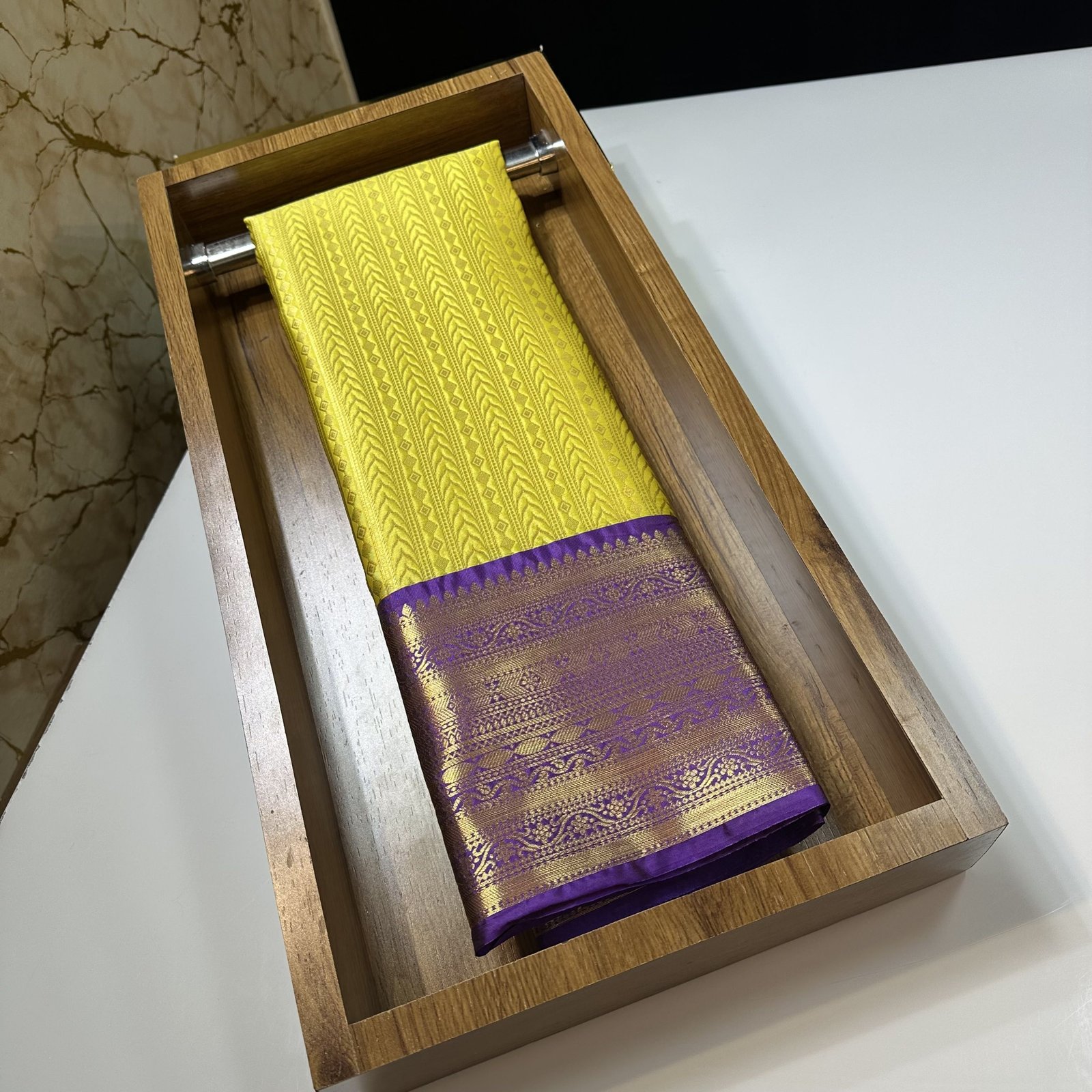 SOFT SEMI-KANCHI BROCADE SAREE IN YELLOW SHADE WITH CONTRAST WEAVING VIOLET KANCHI BORDER