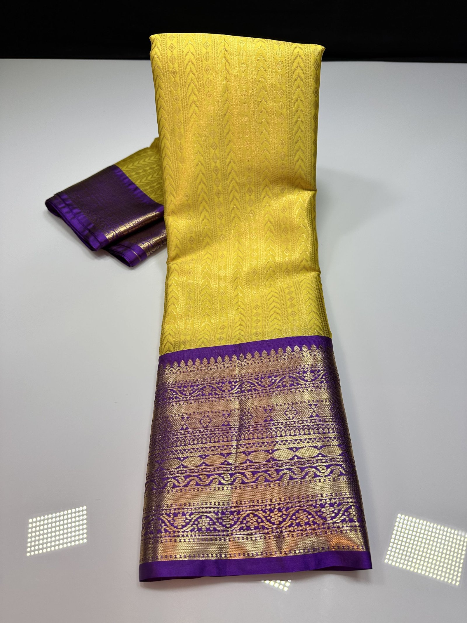 SOFT SEMI-KANCHI BROCADE SAREE IN YELLOW SHADE WITH CONTRAST WEAVING VIOLET KANCHI BORDER