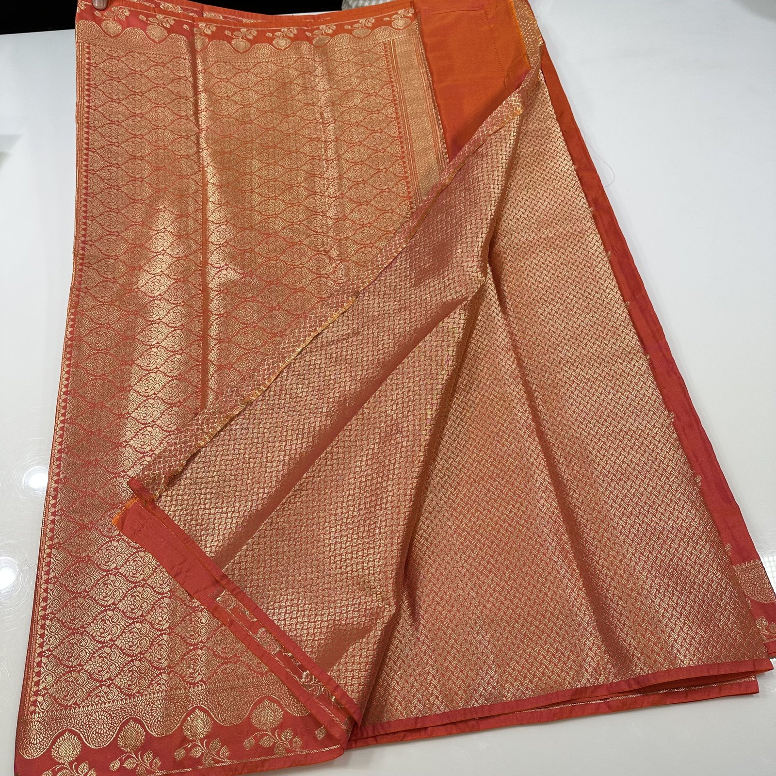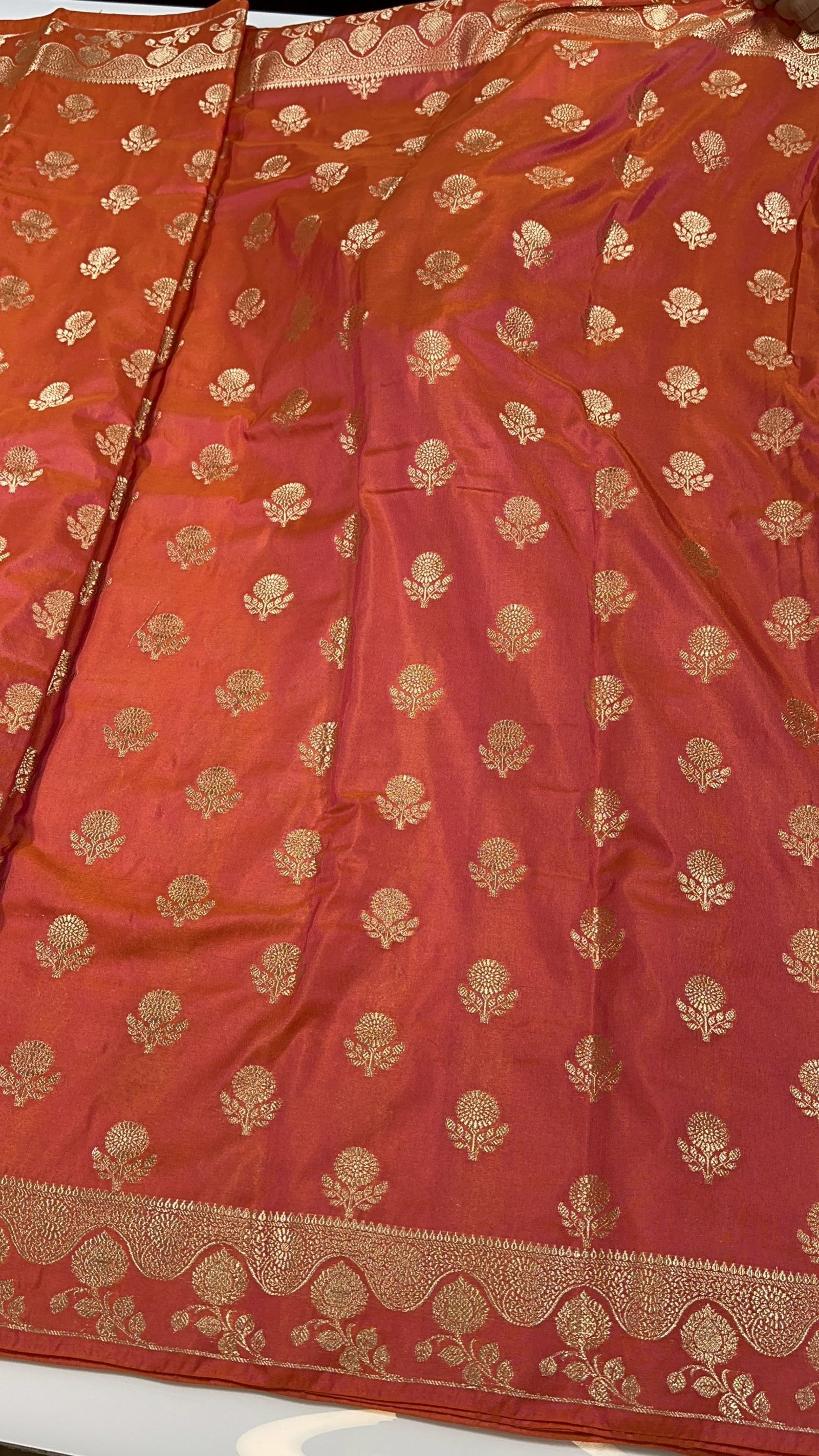 Its standout appeal lies in the rich shaded tone, reminiscent of authentic Banarasi silk color gradations, giving it a soft, luminous finish. Lightweight, smooth, and easy to drape, this saree is perfect for effortless festive styling with a touch of heritage sophistication.