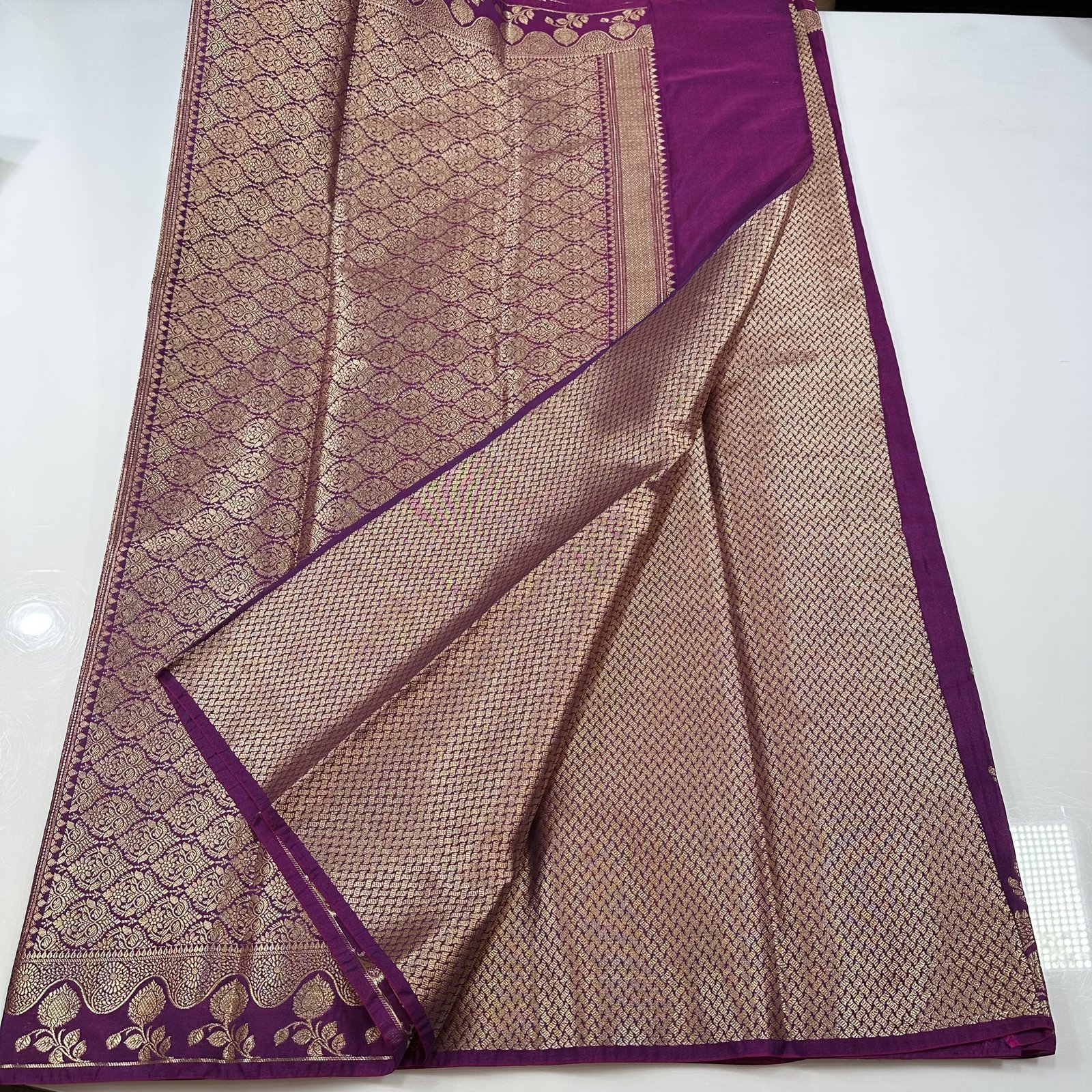 Its standout appeal lies in the rich shaded tone, reminiscent of authentic Banarasi silk color gradations, giving it a soft, luminous finish. Lightweight, smooth, and easy to drape, this saree is perfect for effortless festive styling with a touch of heritage sophistication.