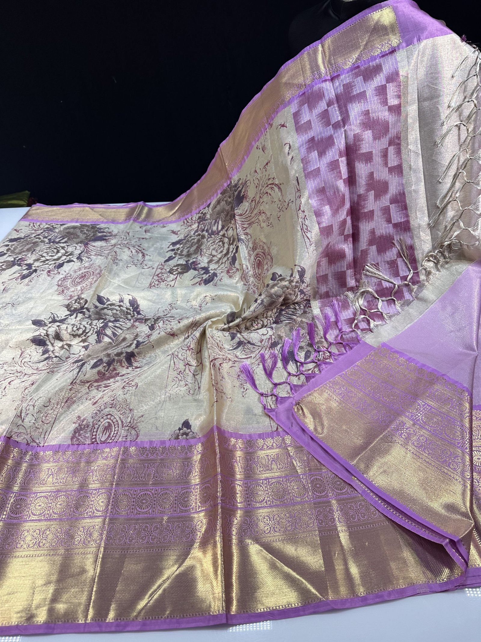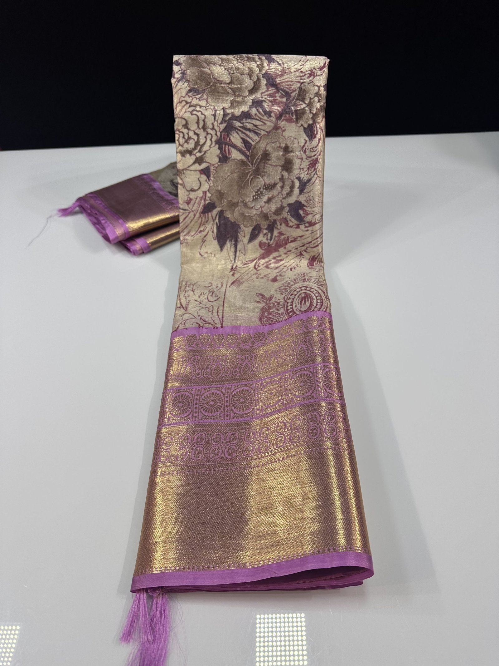 The soft Banarasi tissue silk saree with digital printed jaal allover saree having lavender shade Kanchi border