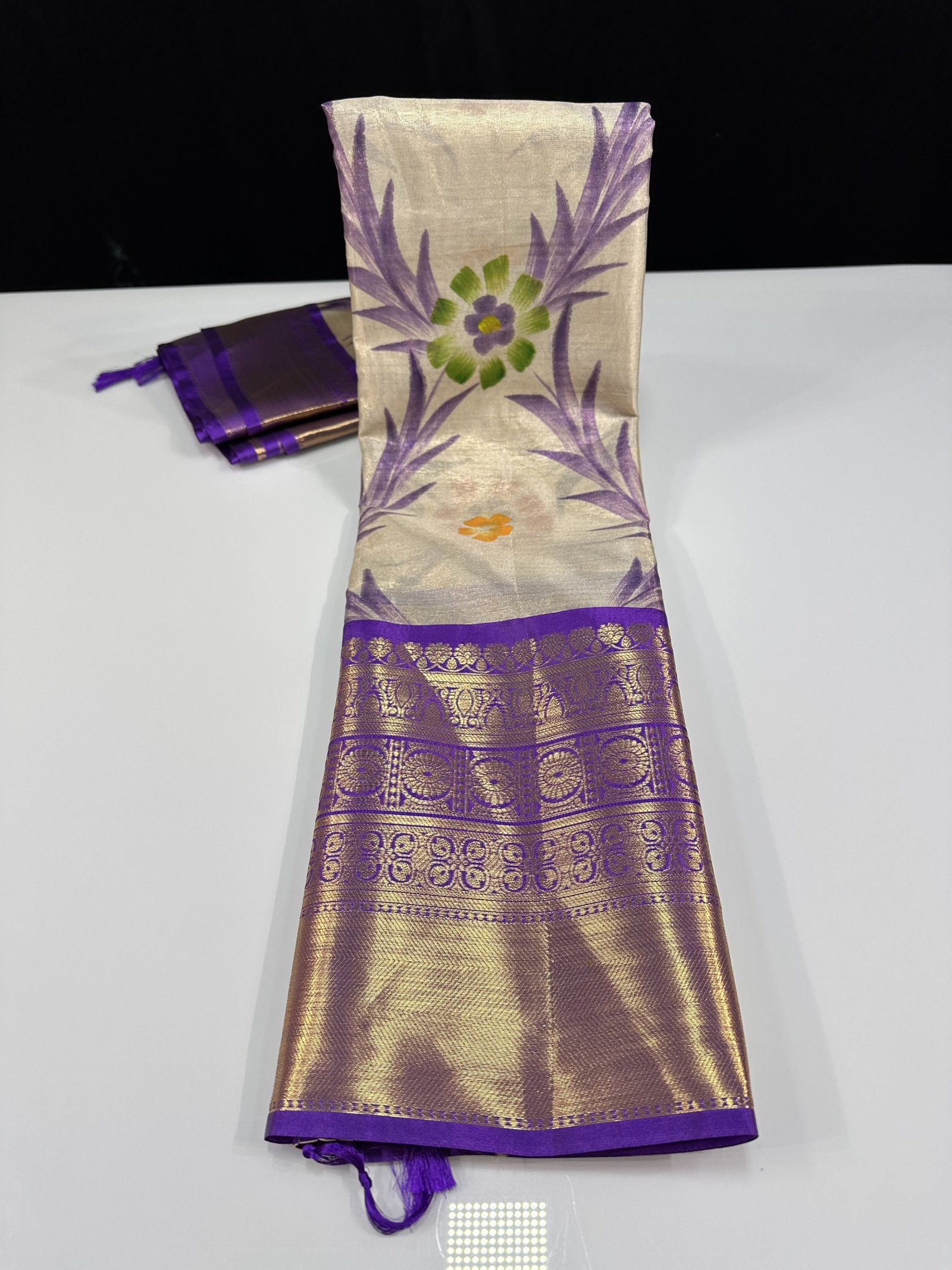 A soft and lightweight Banarasi tissue silk saree featuring an elegant hand-painted jaal pattern flowing across the body. The delicate artwork is beautifully complemented by a contrast border inspired by classic Kanchi designs, adding a refined traditional touch. Easy to drape and graceful in appeal, this saree is perfect for effortless elegance with artistic charm.