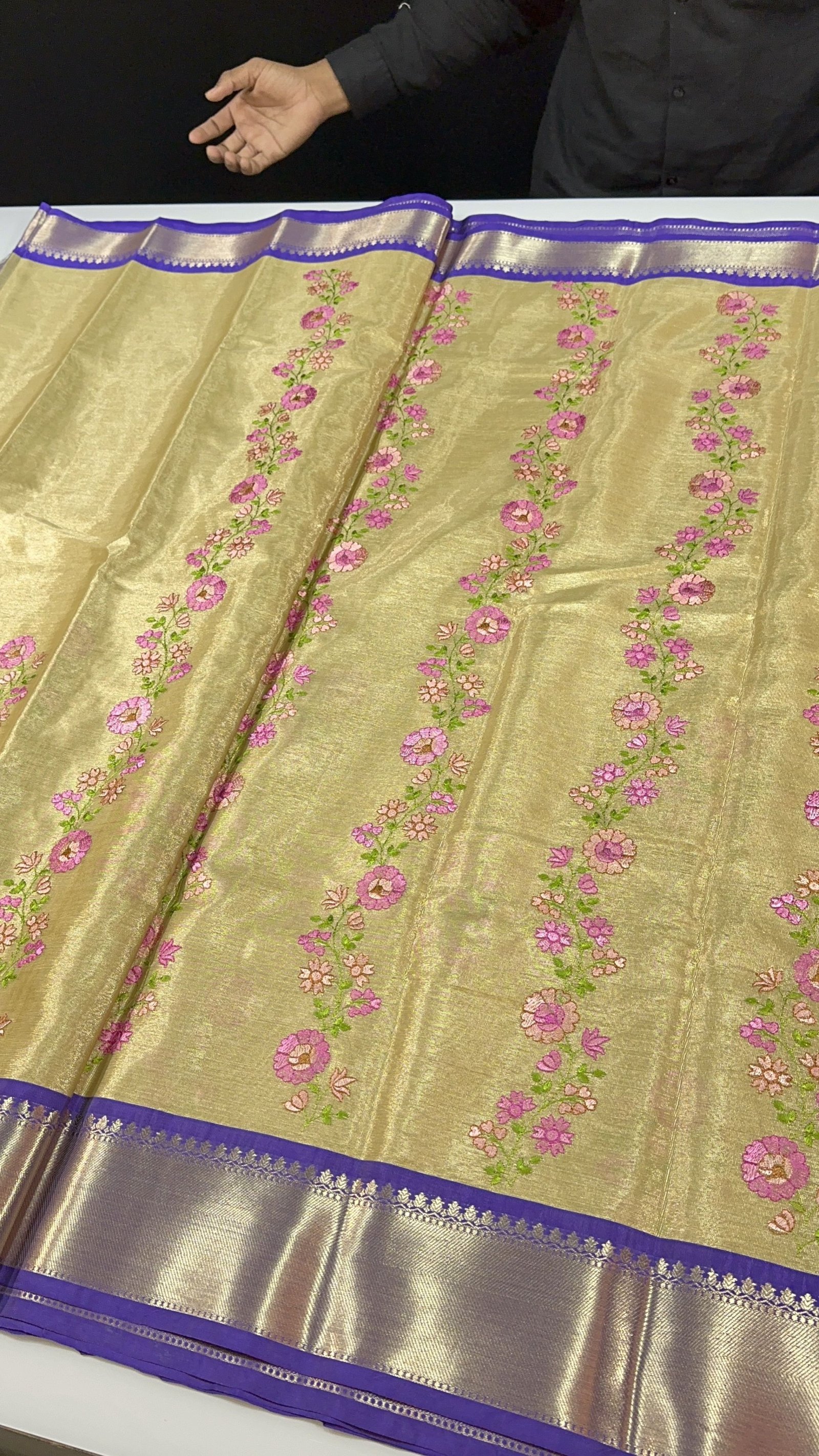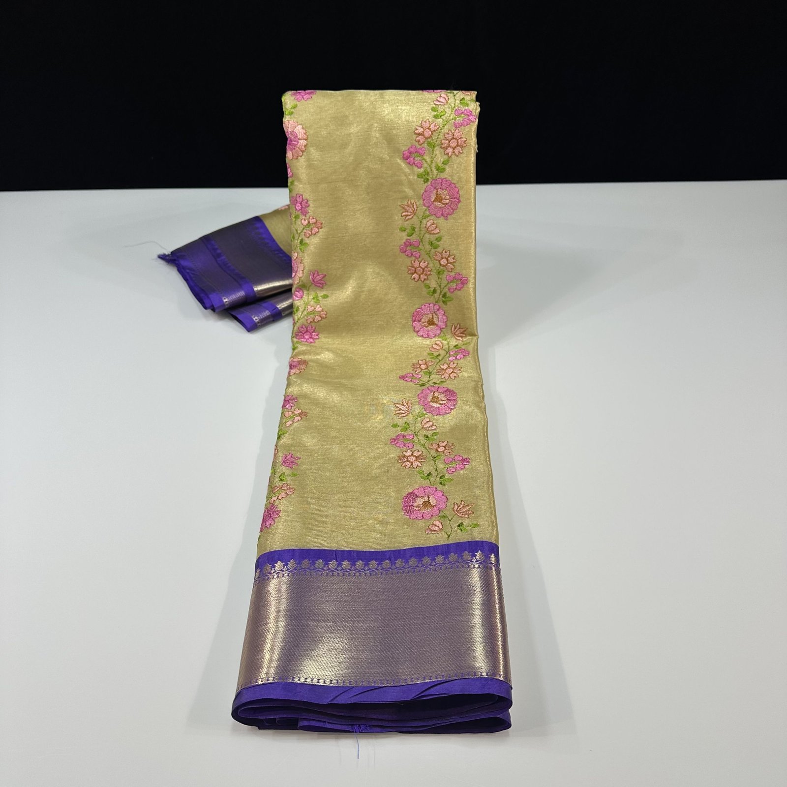 SOFT BANARASI TISSUE SILK SAREE WITH CONTRAST WEAVING SMALL ZARI BORDER WITH EMBROIDERY WORK JAAL OVER BODY