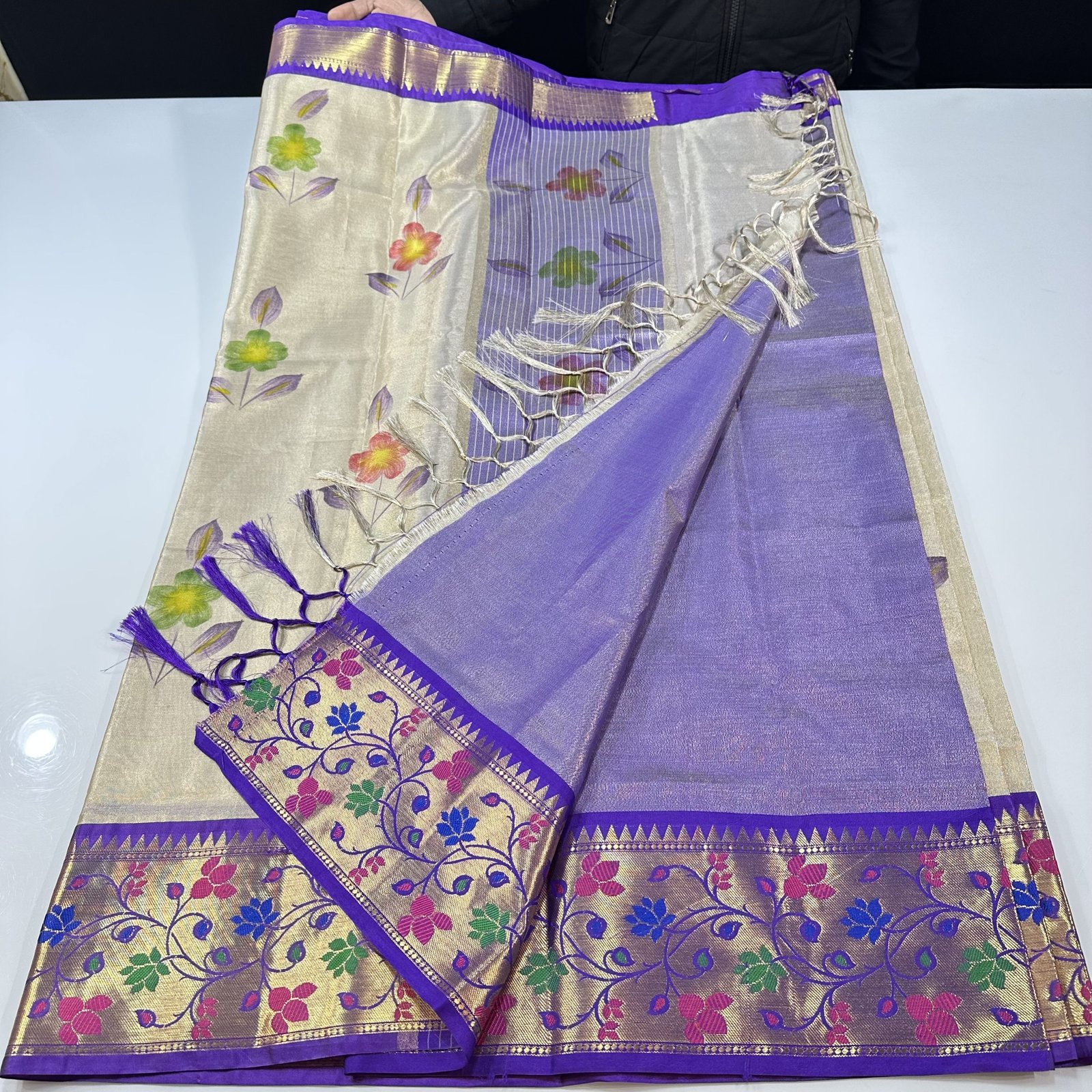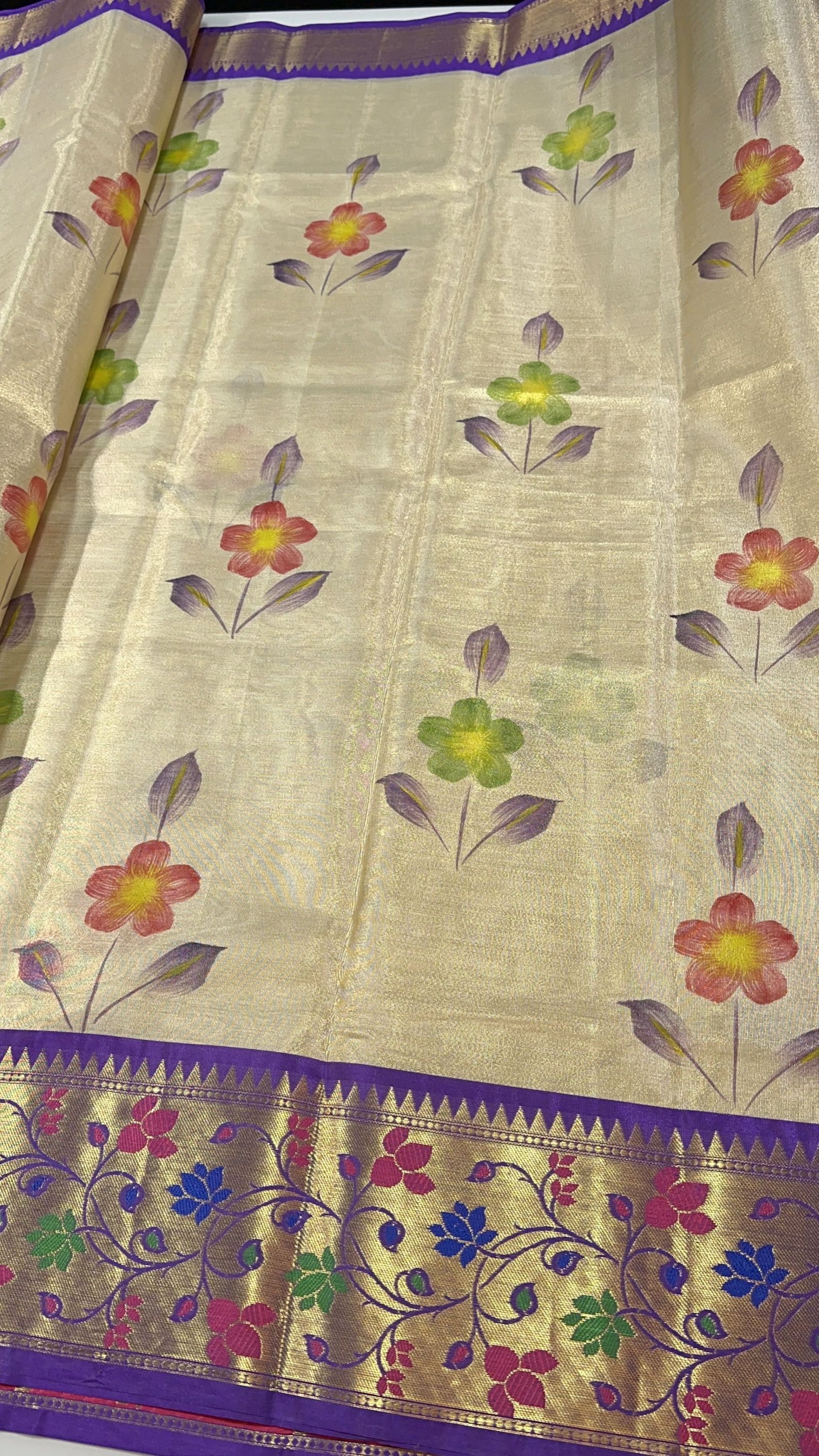 A soft Banarasi tissue silk saree in an elegant ivory shade, beautifully highlighted with hand-painted floral boota work across the body. The look is enhanced by a contrast border featuring intricate Pathani weaving, adding a refined traditional touch. Light, graceful, and easy to drape, this saree is perfect for festive occasions and timeless celebrations.
