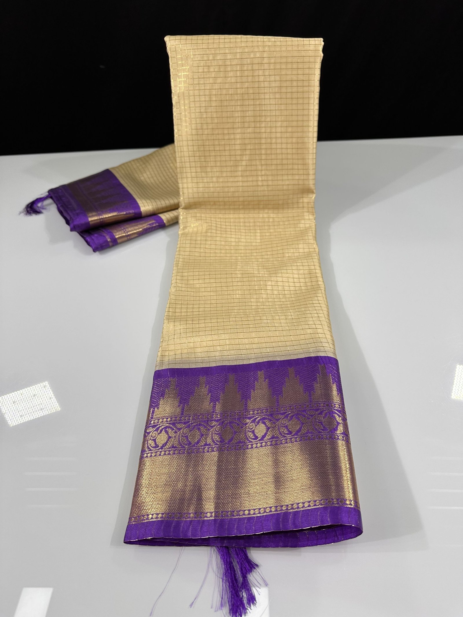 An elegant off-white saree featuring delicate checkered weaving across the body, beautifully complemented by a contrast border. The border is adorned with a classic temple design, intricately woven in rich golden zari, adding a timeless traditional charm perfect for festive and cultural occasions.