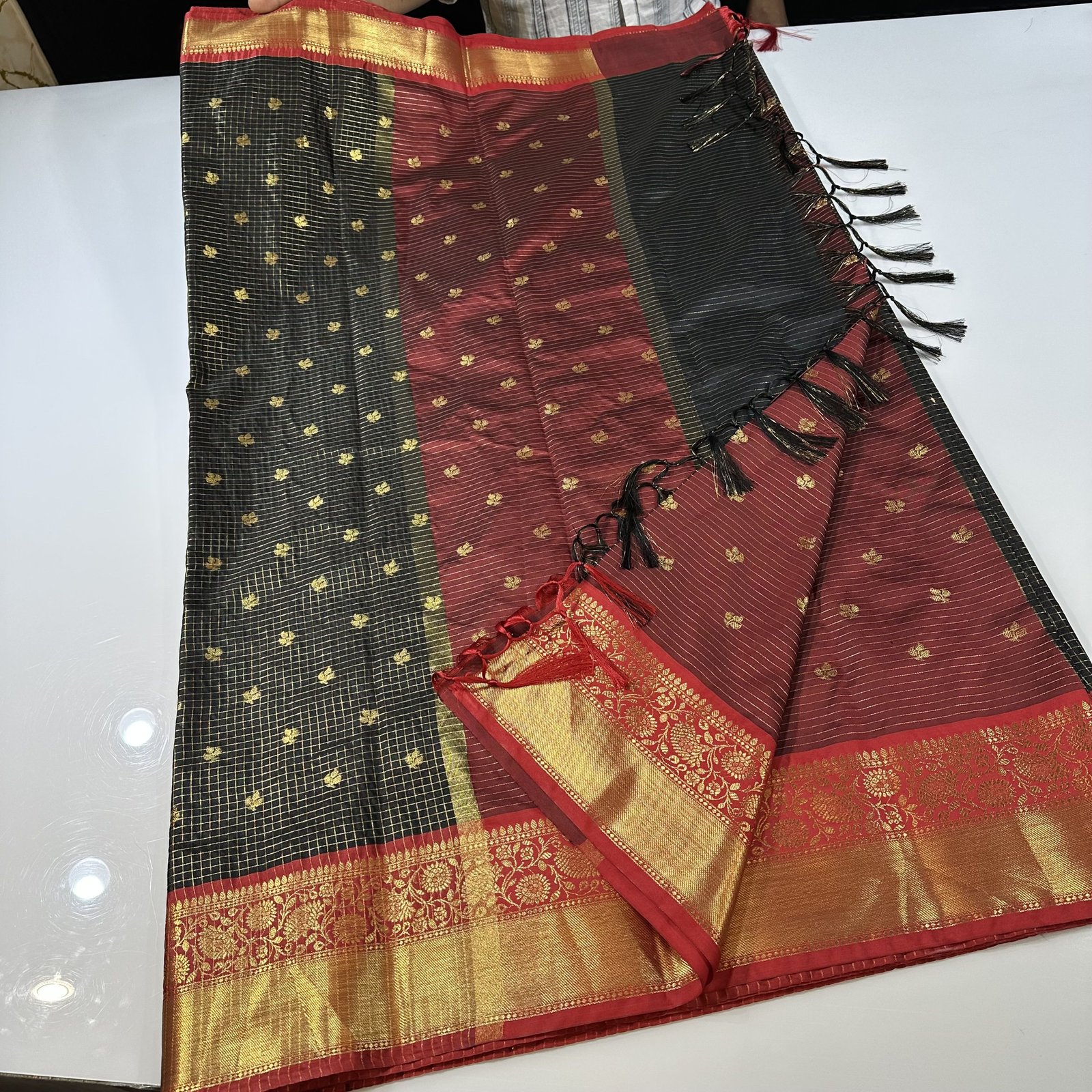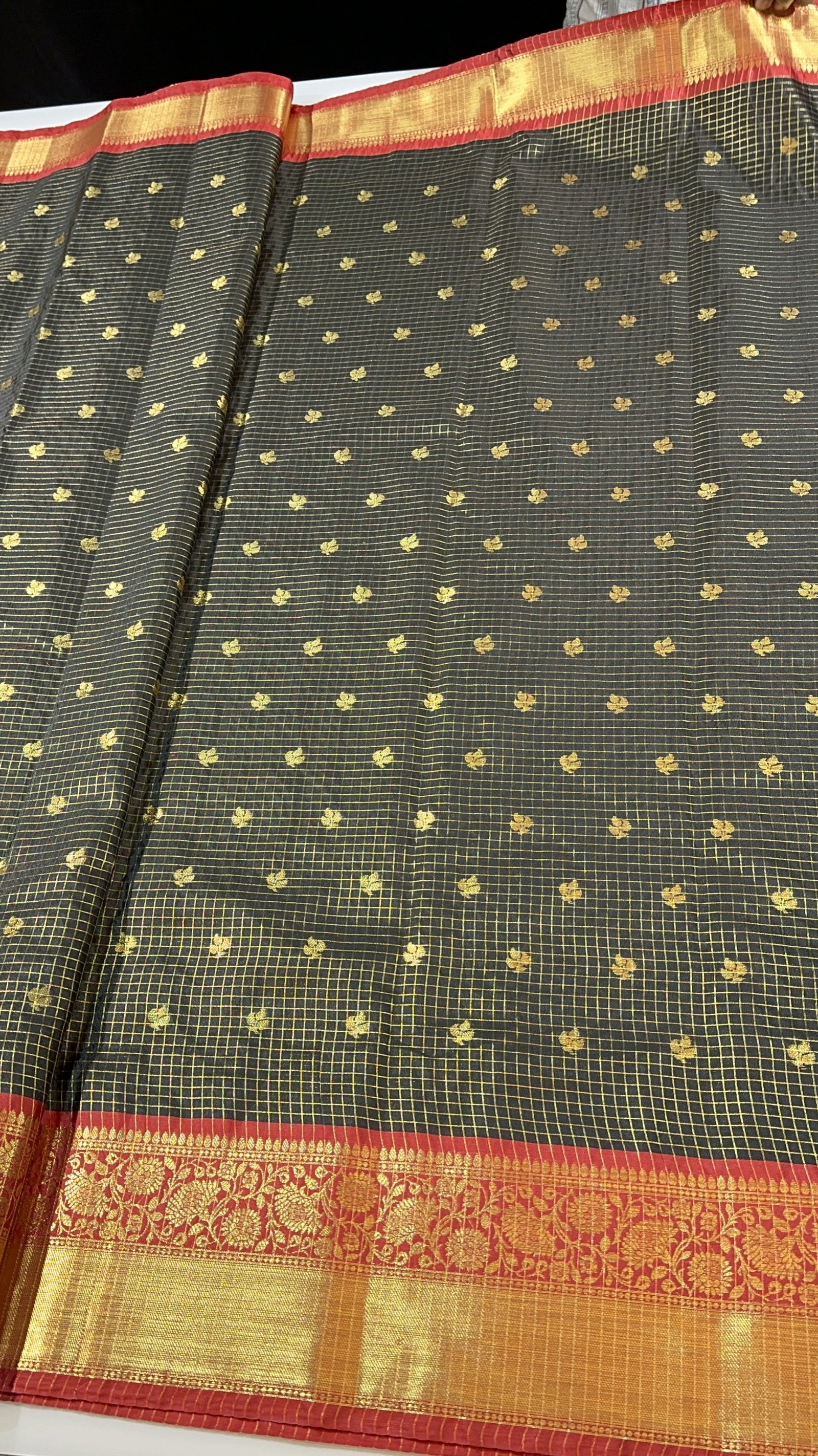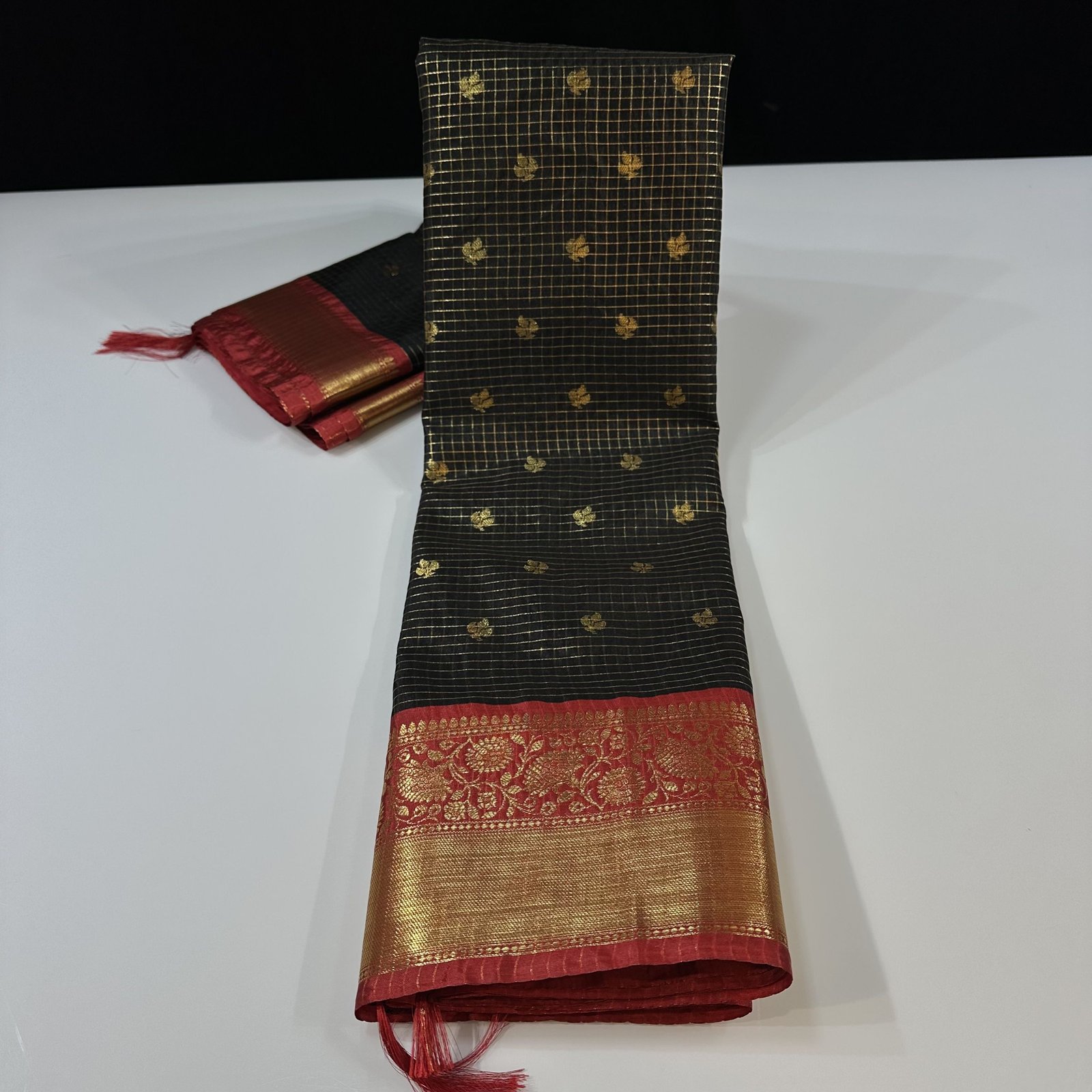 This elegant Banarasi soft silk saree is a timeless creation inspired by the charm of vintage heirloom weaves. The body features a refined zari-woven checks pattern, beautifully enhanced with delicate zari motifs that add depth and traditional richness to the design. Soft in texture and fluid in drape, the saree offers both comfort and grace. It is finished with neatly woven contrast small zari borders that frame the saree with understated sophistication. Perfect for festive occasions, cultural gatherings, and classic celebrations, this saree reflects the enduring beauty of Banarasi craftsmanship.