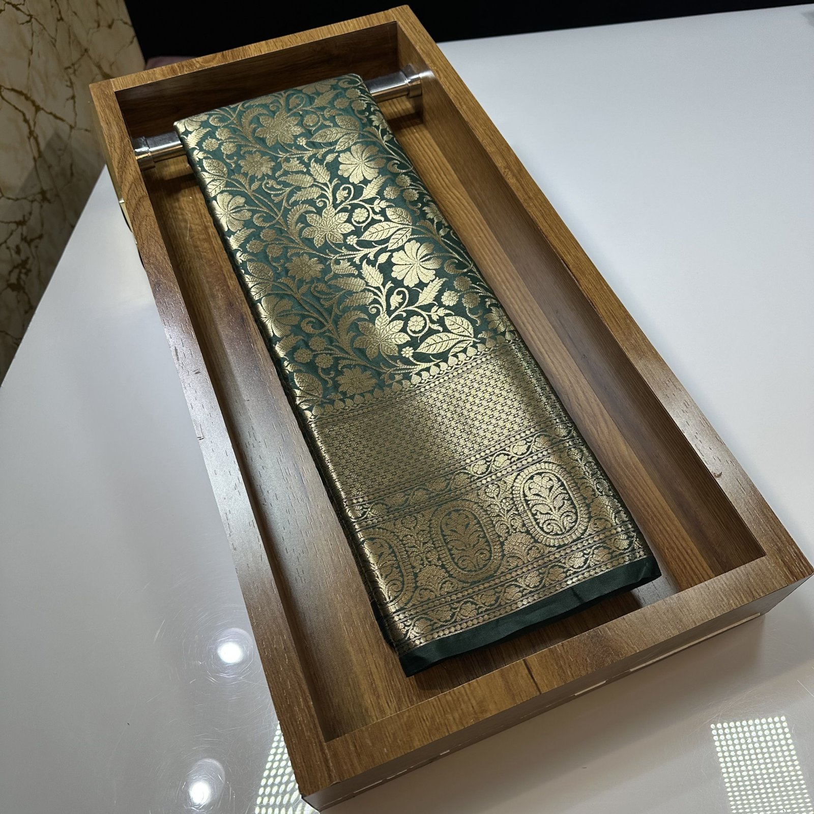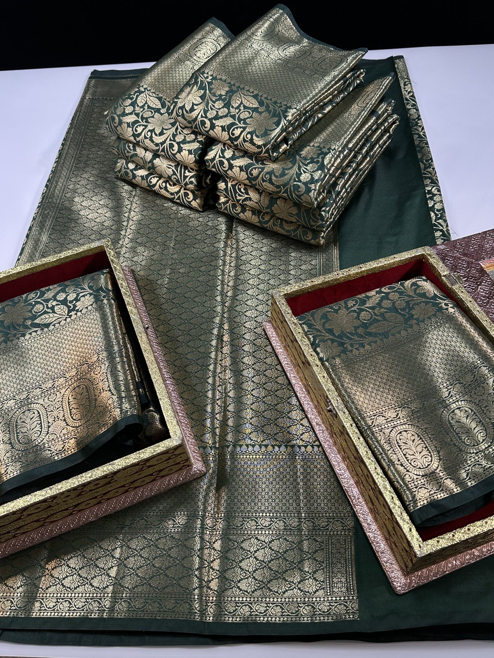 Experience timeless grandeur with this soft Banarasi semi-silk brocade saree crafted in a Kanchi-inspired pattern. The body of the saree is beautifully adorned with rich bridal-inspired brocade weaving in an elegant self-shade design, creating a luxurious texture that reflects the magnificence of traditional Indian craftsmanship.