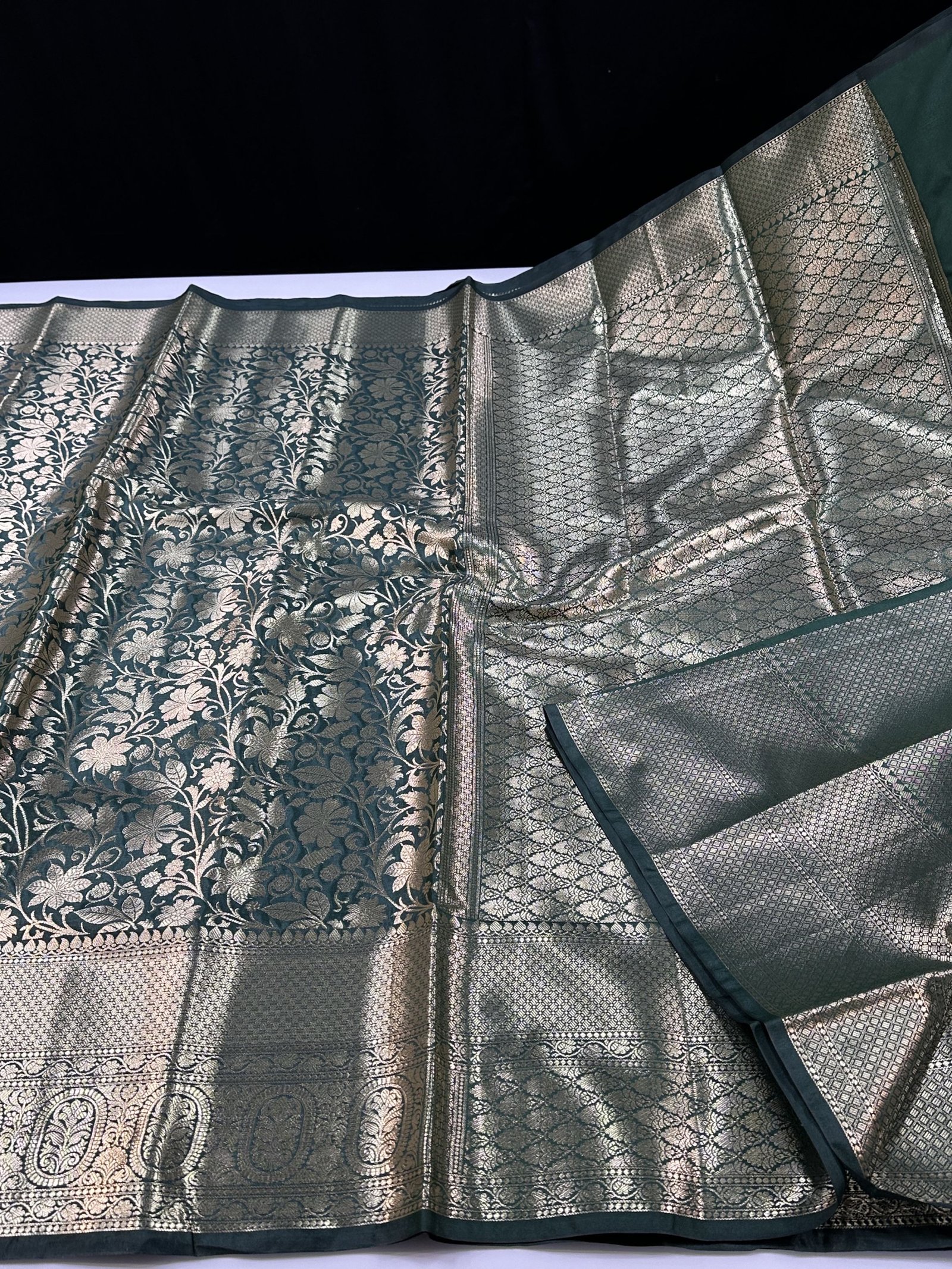The intricate brocade pattern spreads gracefully across the saree, giving it a regal and opulent appeal, while the Kanchi-inspired design adds a touch of classic South Indian influence to the Banarasi weave. The soft semi-silk fabric ensures a comfortable drape while maintaining the richness and grandeur that brocade sarees are known for.