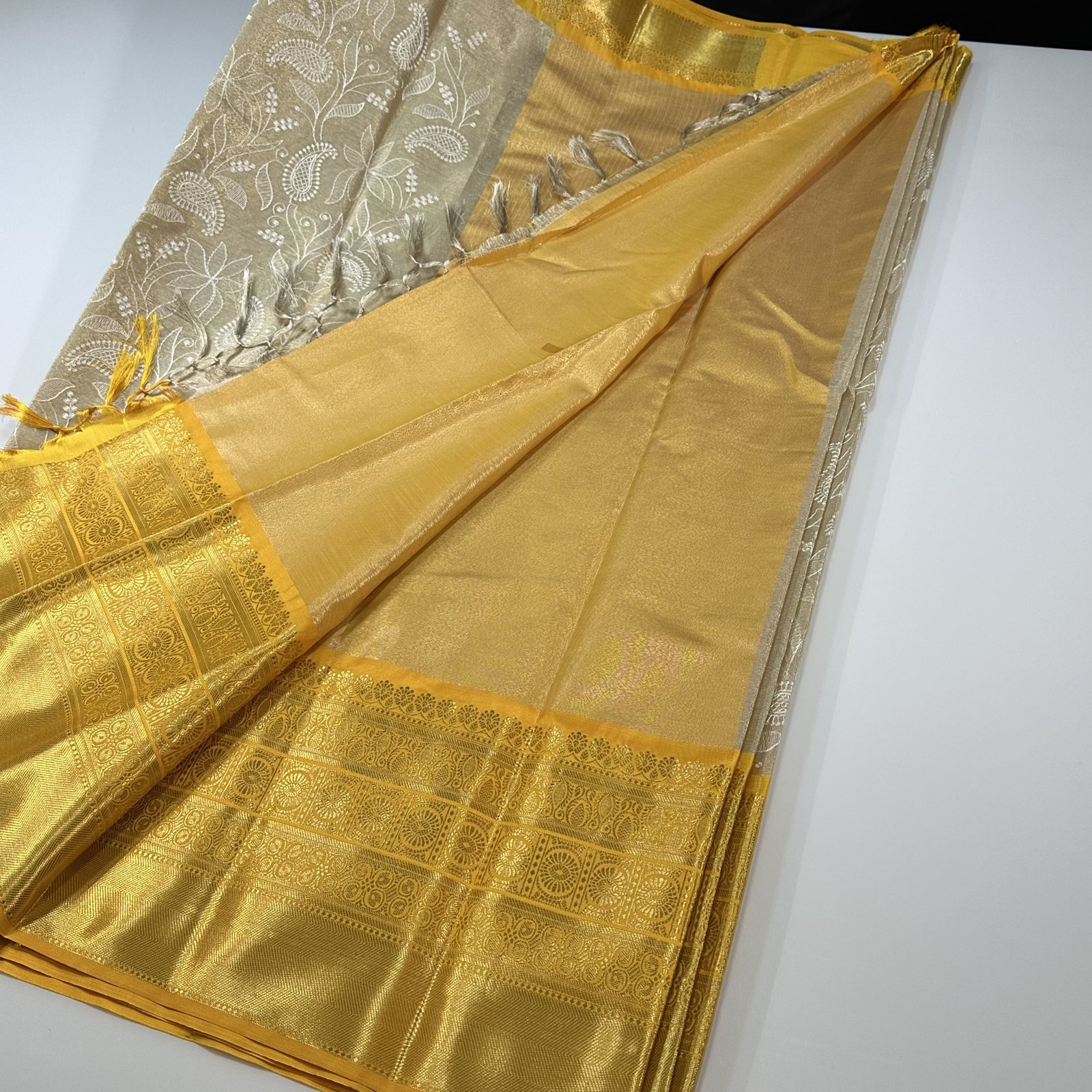 Grace meets artistry in this Soft Banarasi Semi-Tissue Silk Saree, exquisitely enhanced with Chikankari–inspired embroidery jaal crafted in elegant off-white thread. The lightweight semi-tissue silk fabric offers a soft, fluid drape with a gentle sheen, making it comfortable yet striking. The intricate jaal embroidery spread across the body adds depth and texture, drawing inspiration from classic motifs while maintaining a refined, contemporary appeal. Perfect for festive occasions, weddings, and elegant gatherings, this saree is a beautiful blend of tradition, craftsmanship, and modern sophistication.