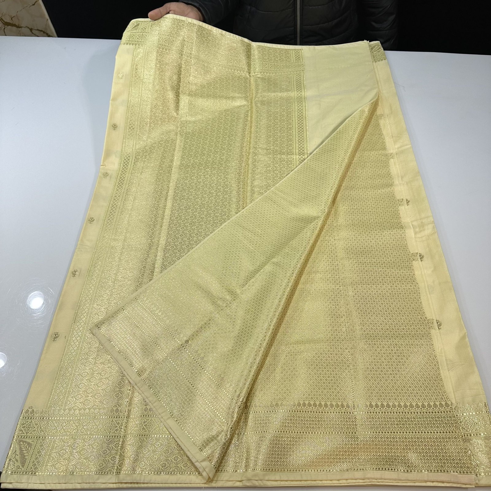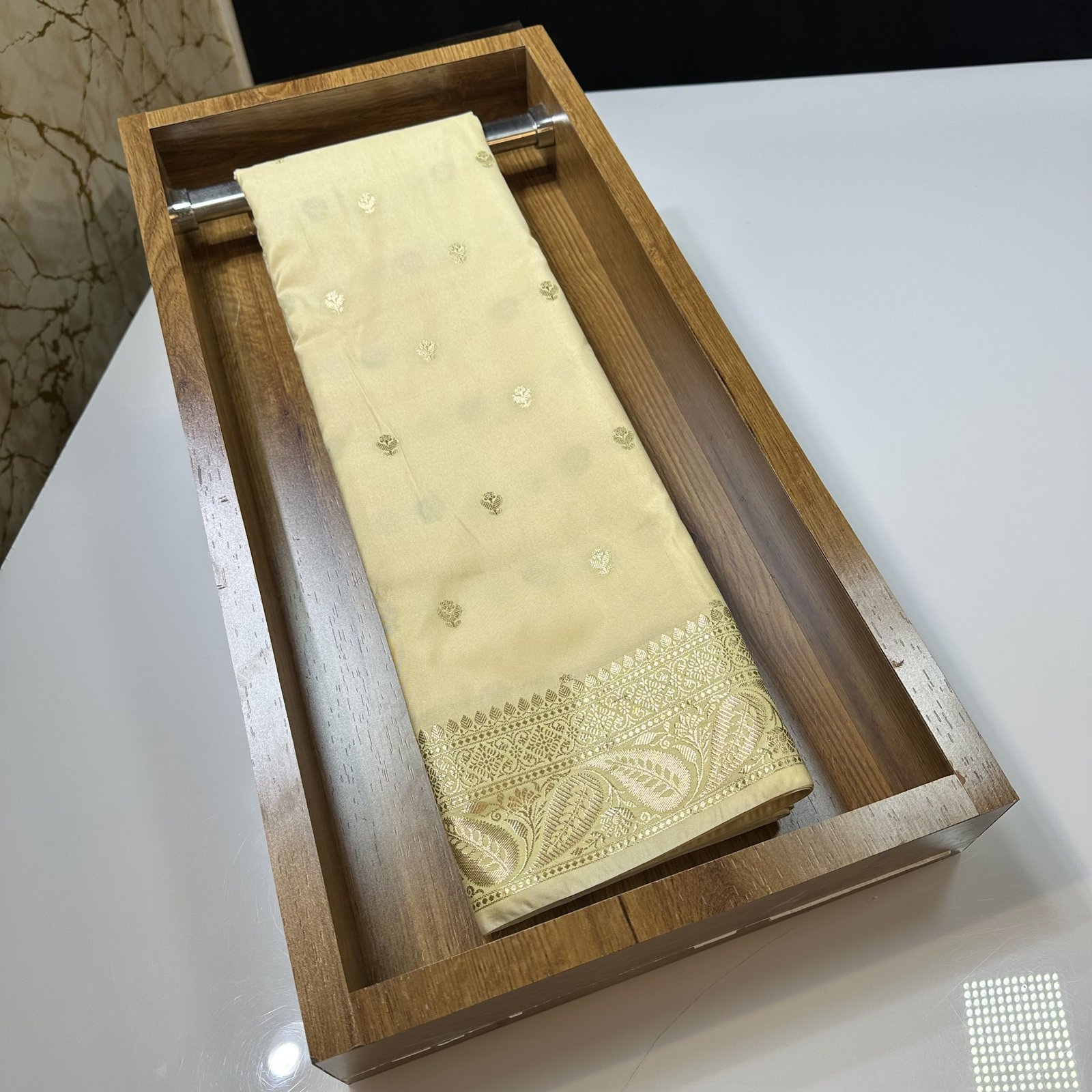 The body is adorned with khadi-inspired small zari boti weaving, lending a subtle handcrafted appeal and timeless texture to the drape. Each boti is delicately placed, enhancing the saree’s elegance without overpowering its simplicity.