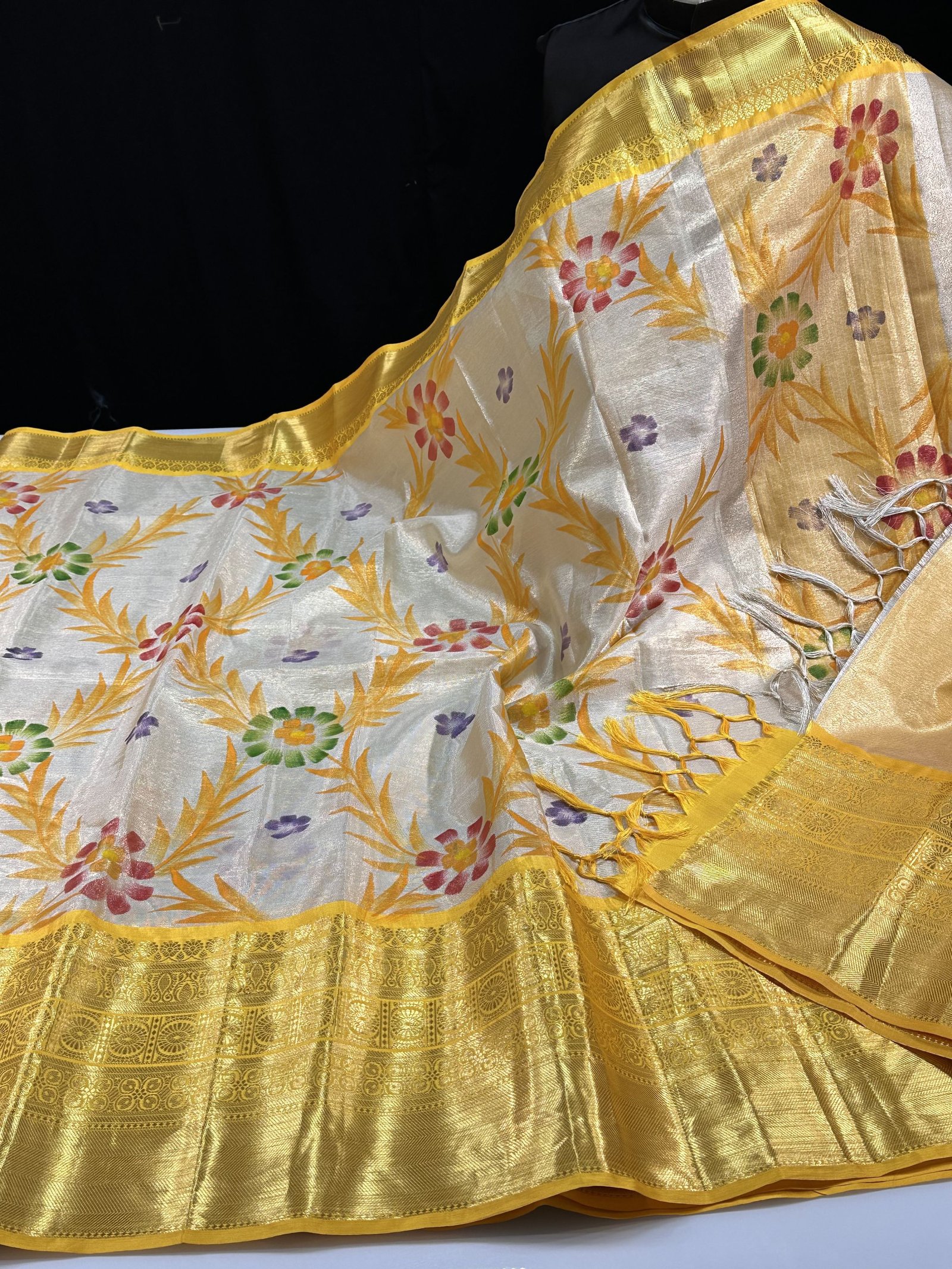 SOFT BANARASI TISSUE SILK SAREE WITH HAND PAINTED FLORAL JAAL ALLOVER SAREE