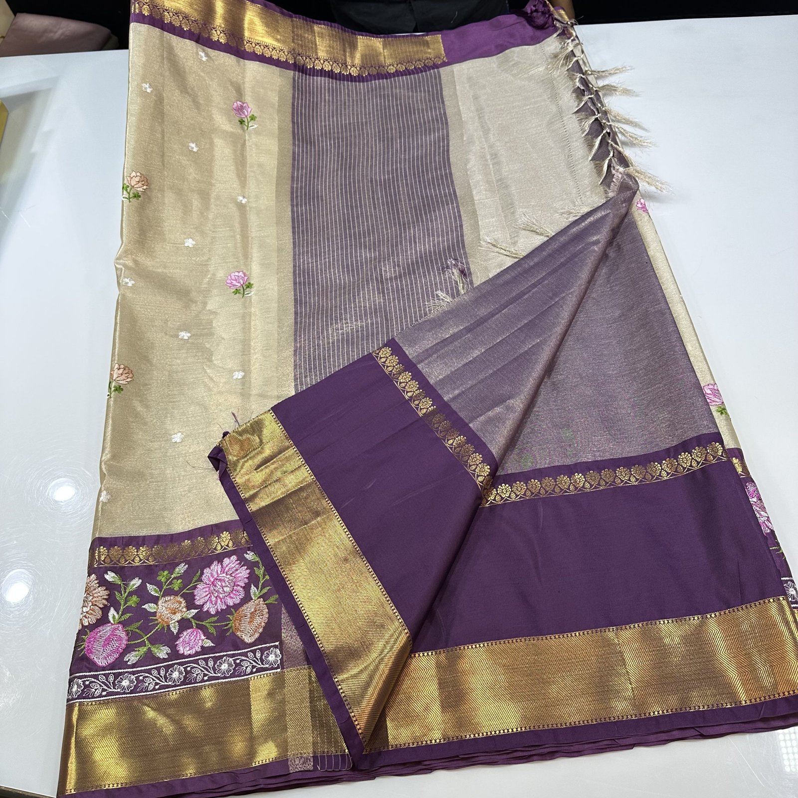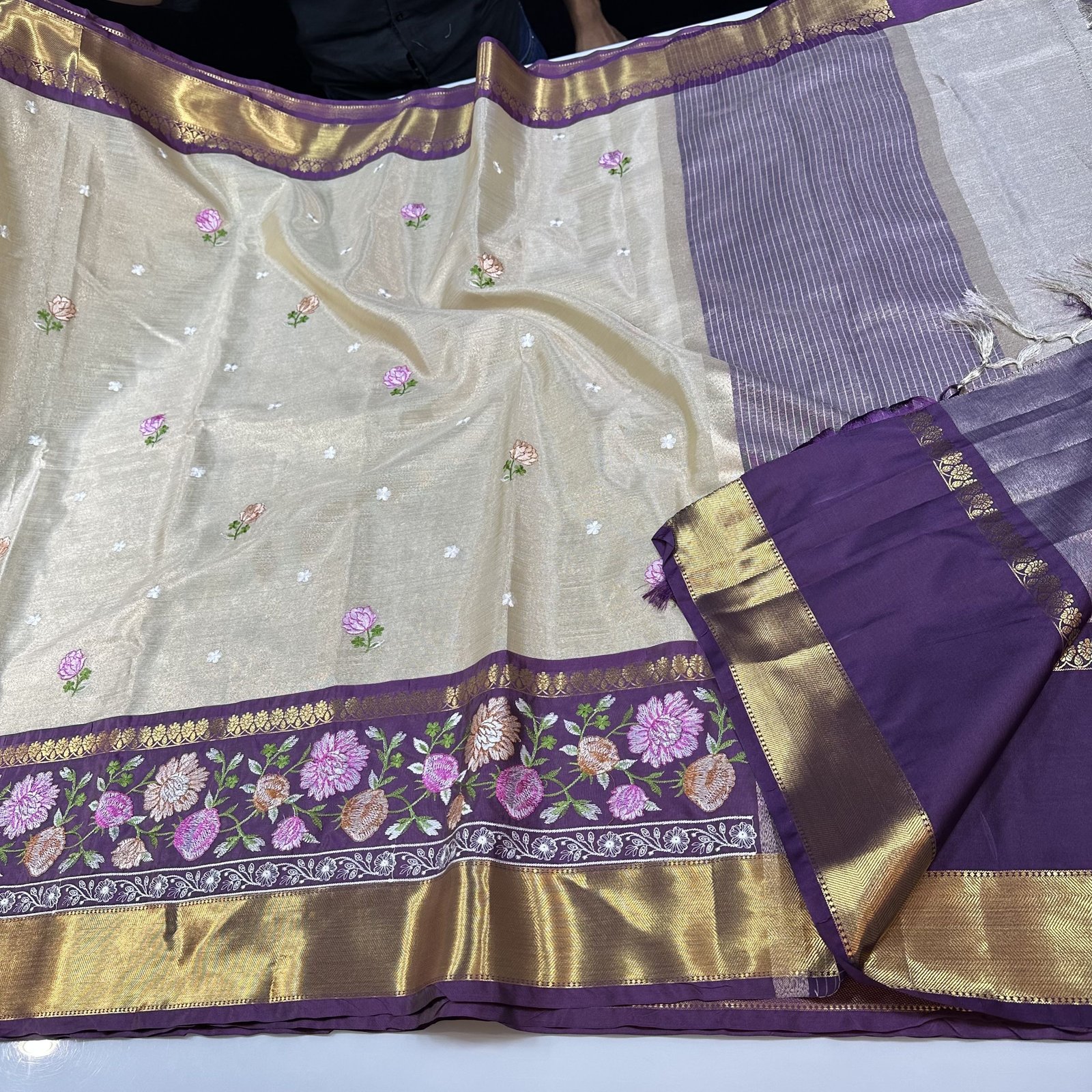 Step into refined elegance with this Soft Banarasi Tissue Silk Saree in a graceful ivory shade, exuding understated luxury and timeless charm. The luminous tissue silk fabric offers a delicate sheen with an airy, lightweight feel, making it a perfect choice for effortless sophistication.