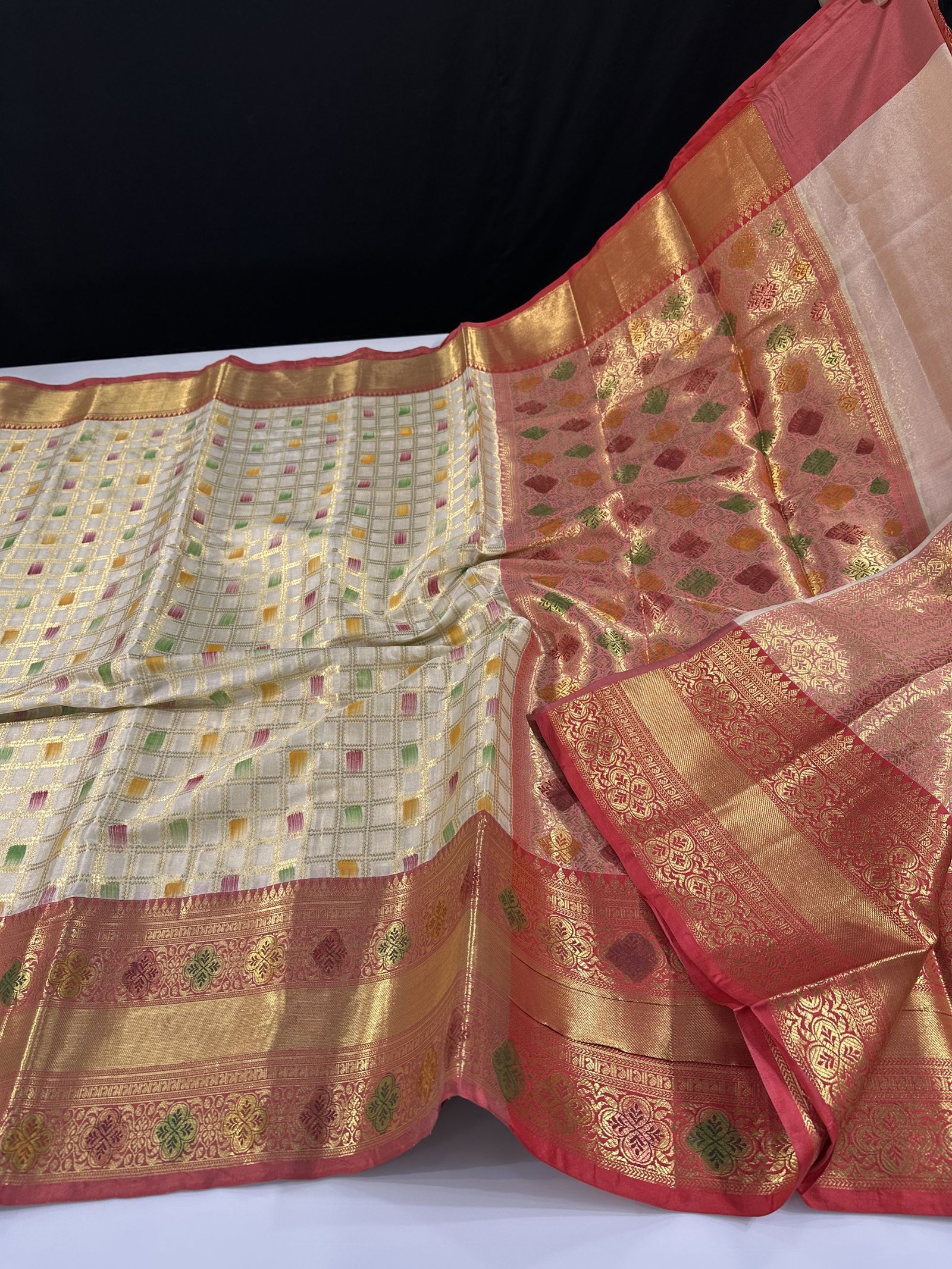 Soft semi-mulberry silk saree with hand painted floral shades over weaving checks allover saree
