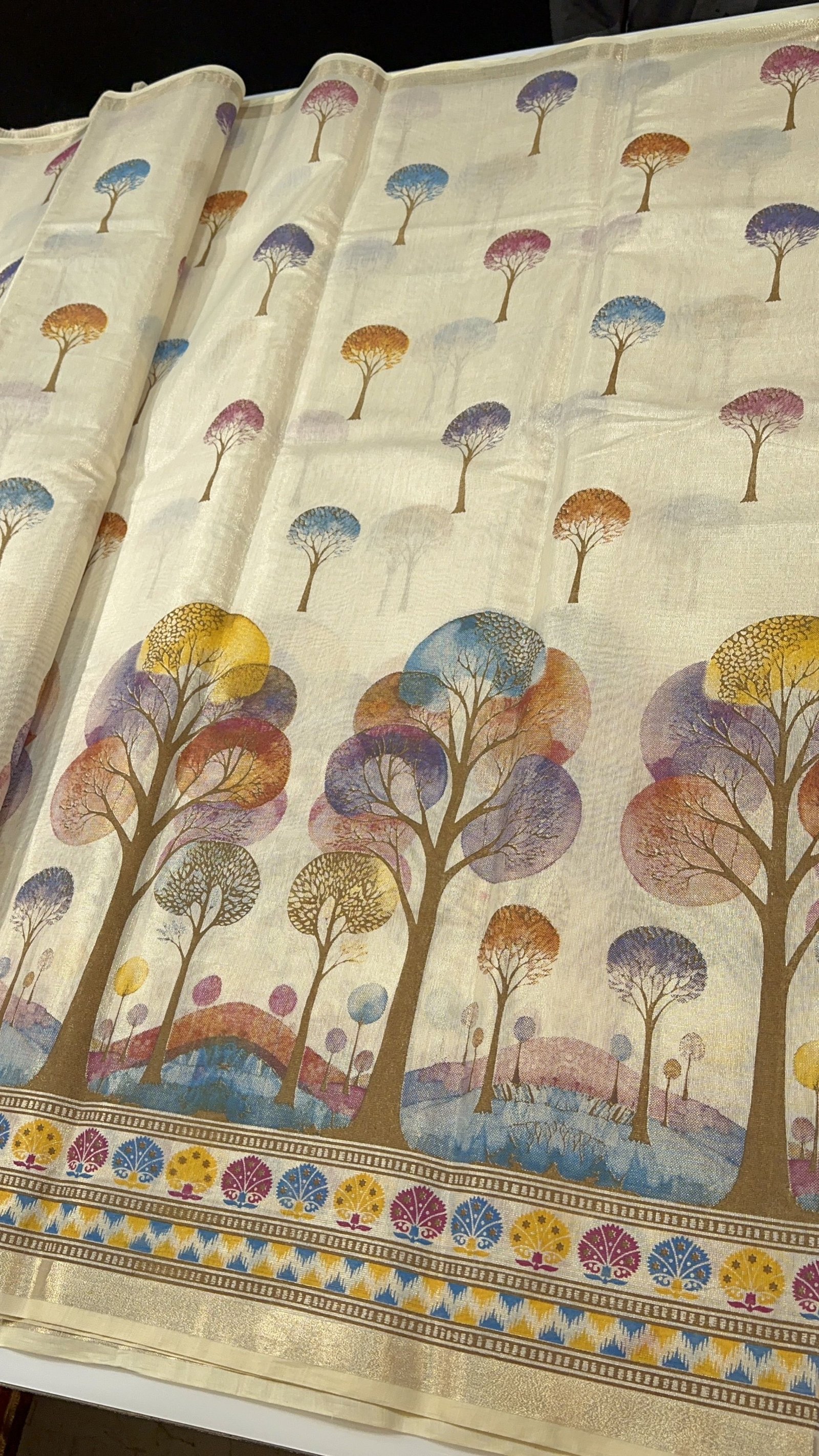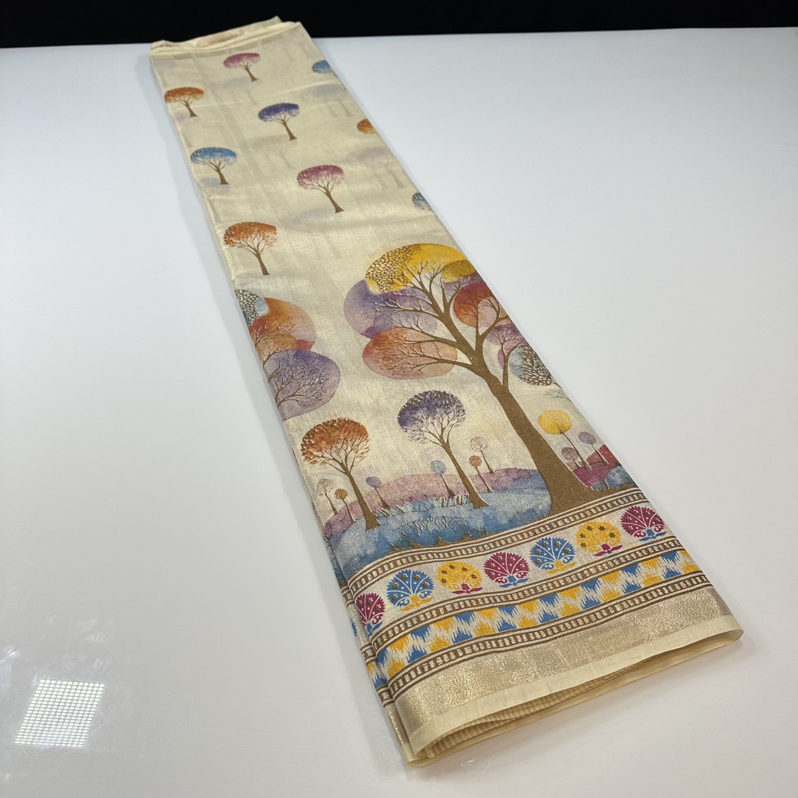 The body of the saree is beautifully adorned with an all-over scenic forest–inspired print, creating a serene, artistic canvas that feels fresh, modern, and soothing to the eye. The nature-inspired motifs flow seamlessly across the saree, giving it a calm yet distinctive charm. A minimal, finely finished border enhances the overall look without overpowering the delicate print, keeping the design clean and graceful.
