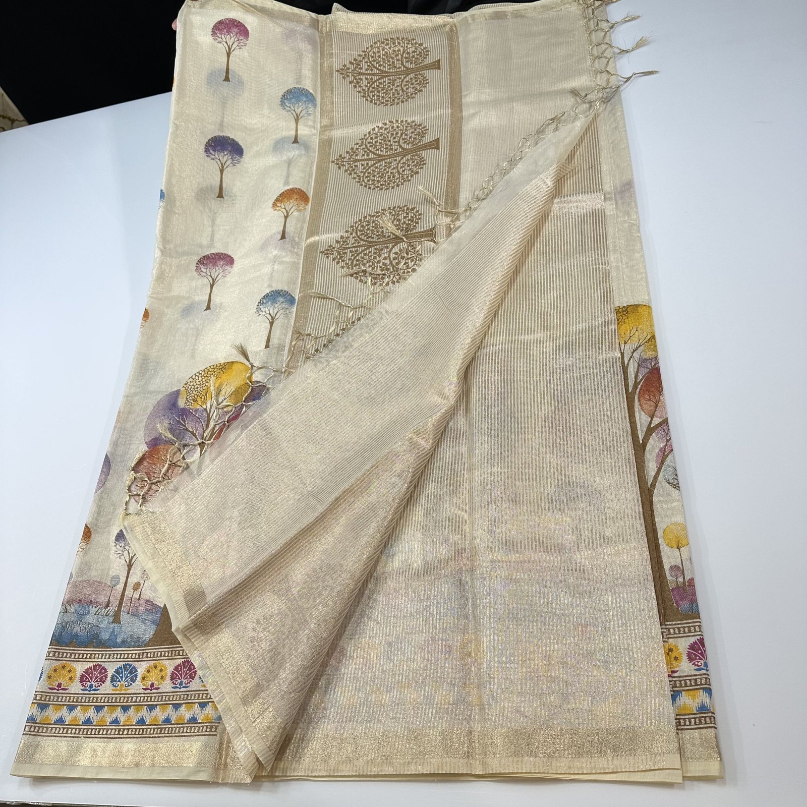 This Banarasi soft tissue silk saree in an elegant ivory shade is a perfect blend of subtle luxury and everyday grace. Crafted in a lightweight and airy tissue silk fabric, the saree drapes effortlessly, making it extremely comfortable to wear for long hours.