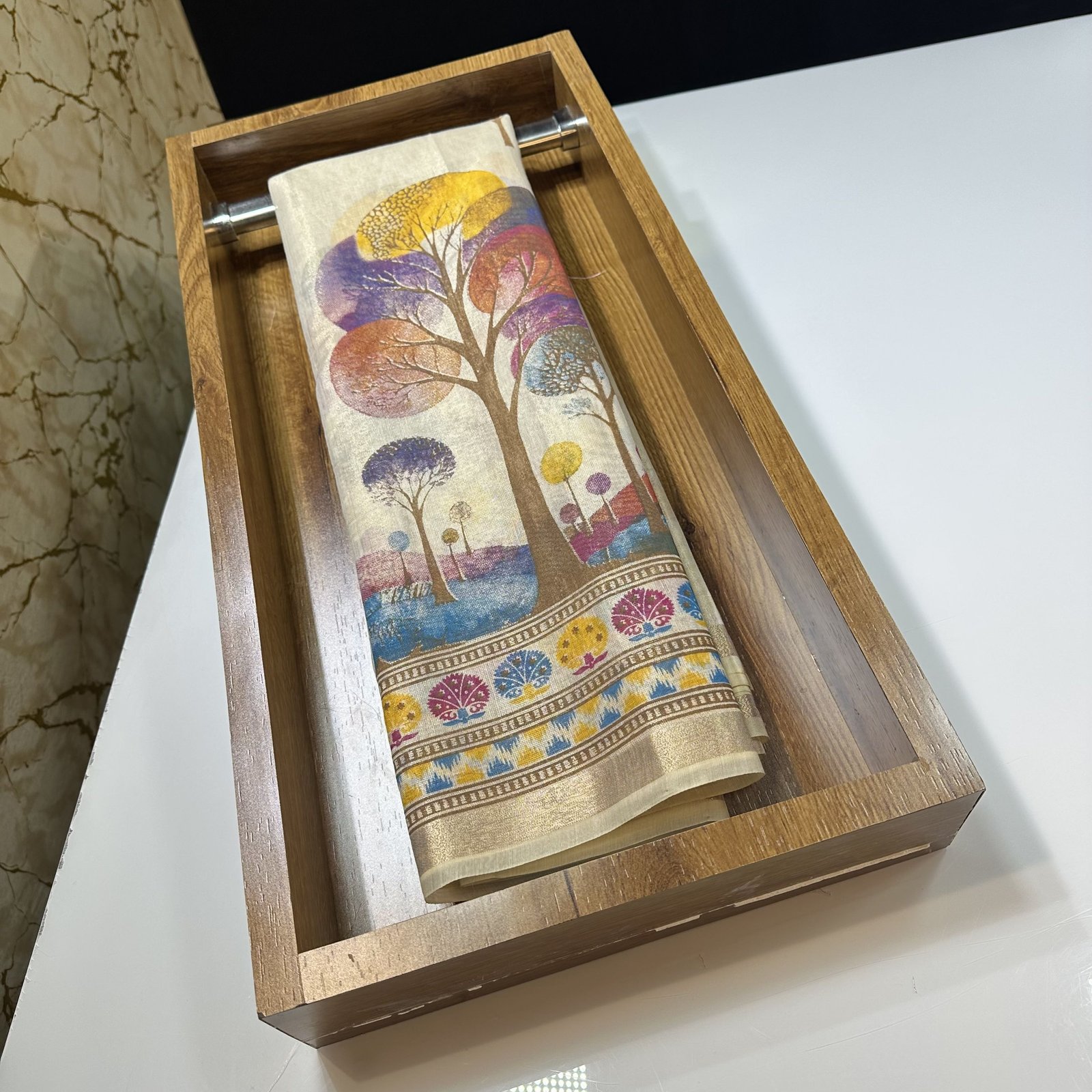 The body of the saree is beautifully adorned with an all-over scenic forest–inspired print, creating a serene, artistic canvas that feels fresh, modern, and soothing to the eye. The nature-inspired motifs flow seamlessly across the saree, giving it a calm yet distinctive charm. A minimal, finely finished border enhances the overall look without overpowering the delicate print, keeping the design clean and graceful.