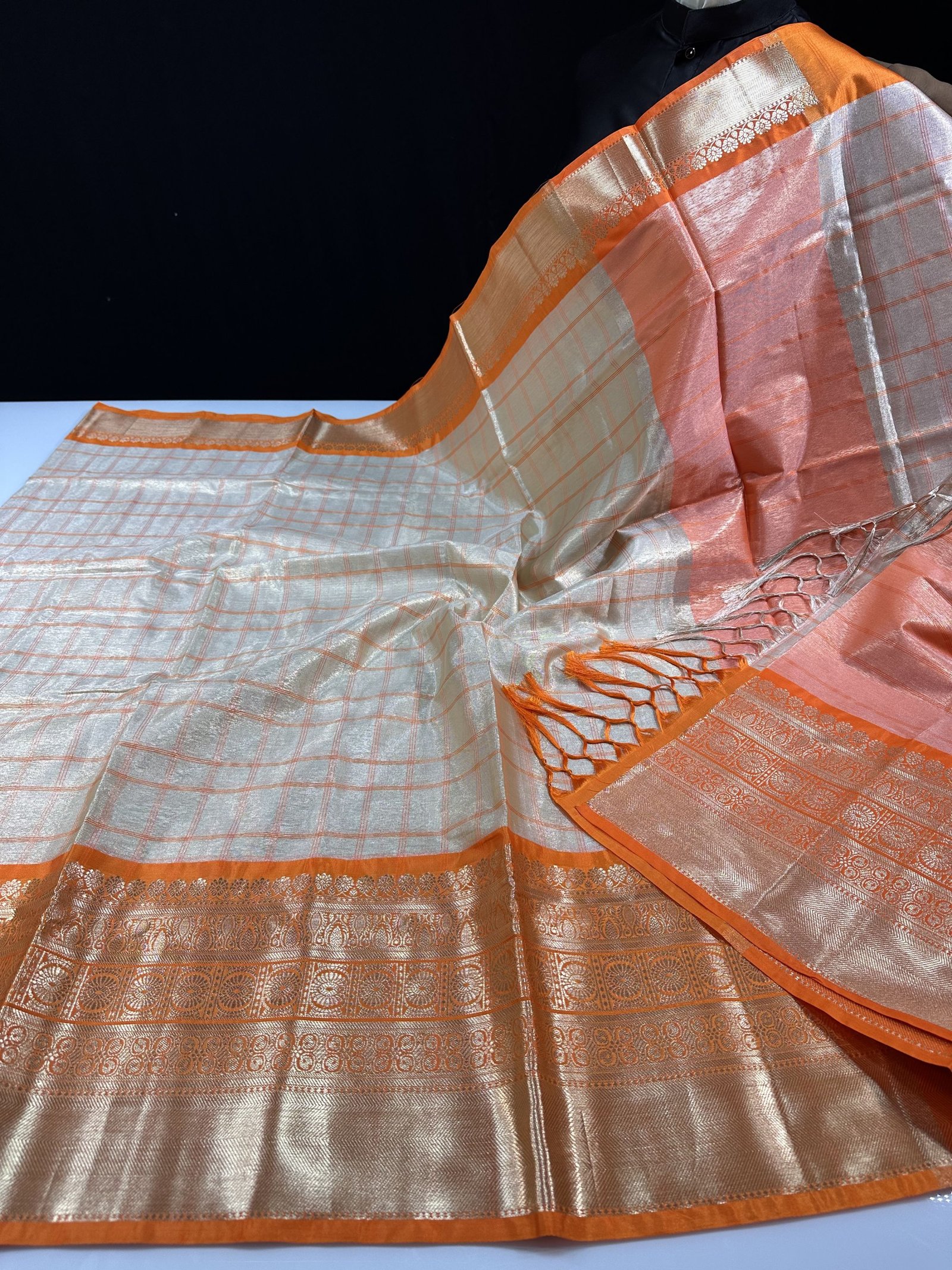 SOFT BANARASI TISSUE SILK SAREE WITH RESHAM WEAVING CHECKS SAREE HAVING CONTRAST WEAVING KANCHI BORDER