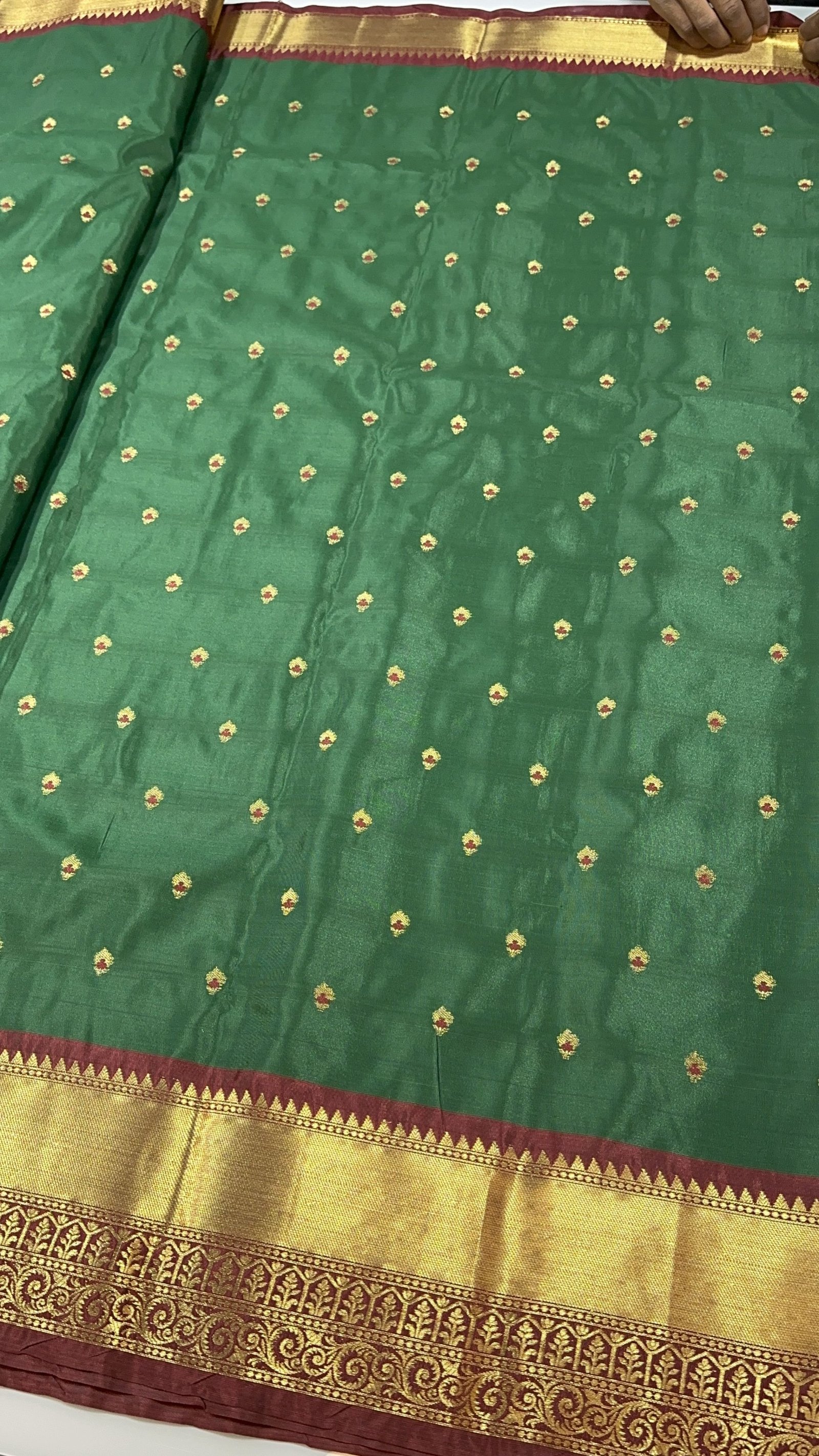 Step into timeless elegance with this Banarasi soft semi-silk saree, beautifully adorned with delicately woven booti motifs across the body. Each booti is enriched with fine Resham Meena work, adding subtle color accents and intricate detailing that highlight classic Banarasi craftsmanship. The soft semi-silk fabric offers a graceful drape with a gentle sheen, making it comfortable yet luxurious. Perfect for weddings, festive occasions, and traditional celebrations, this saree is a harmonious blend of heritage artistry and refined sophistication.