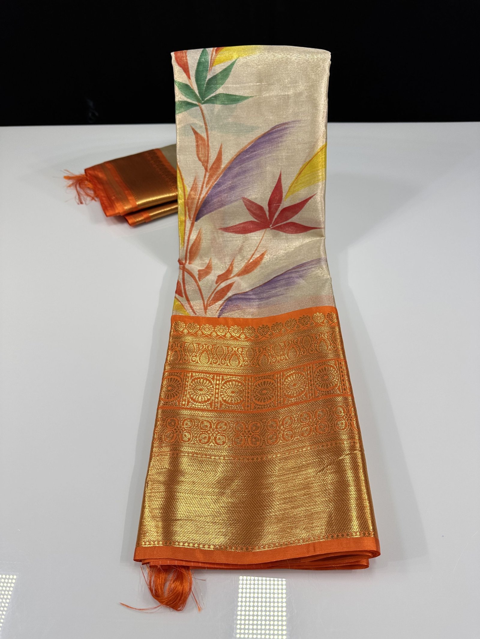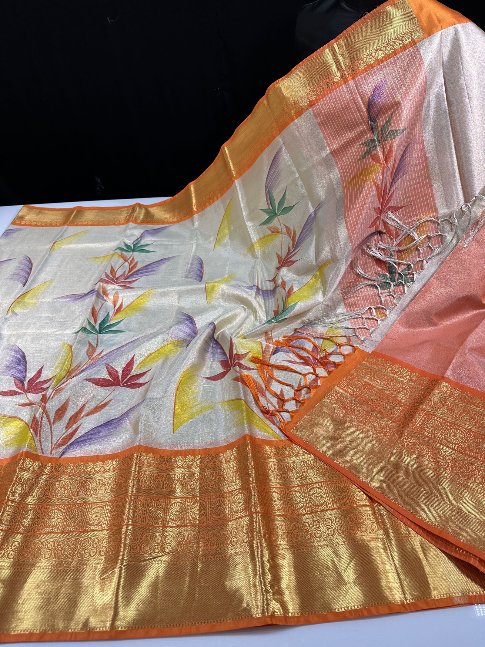 SOFT BANARASI TISSUE SILK SAREE WITH CONTRAST WEAVING KANCHI BORDER HAVING HAND PAINTED FLORAL JAAL ALLOVER SAREE