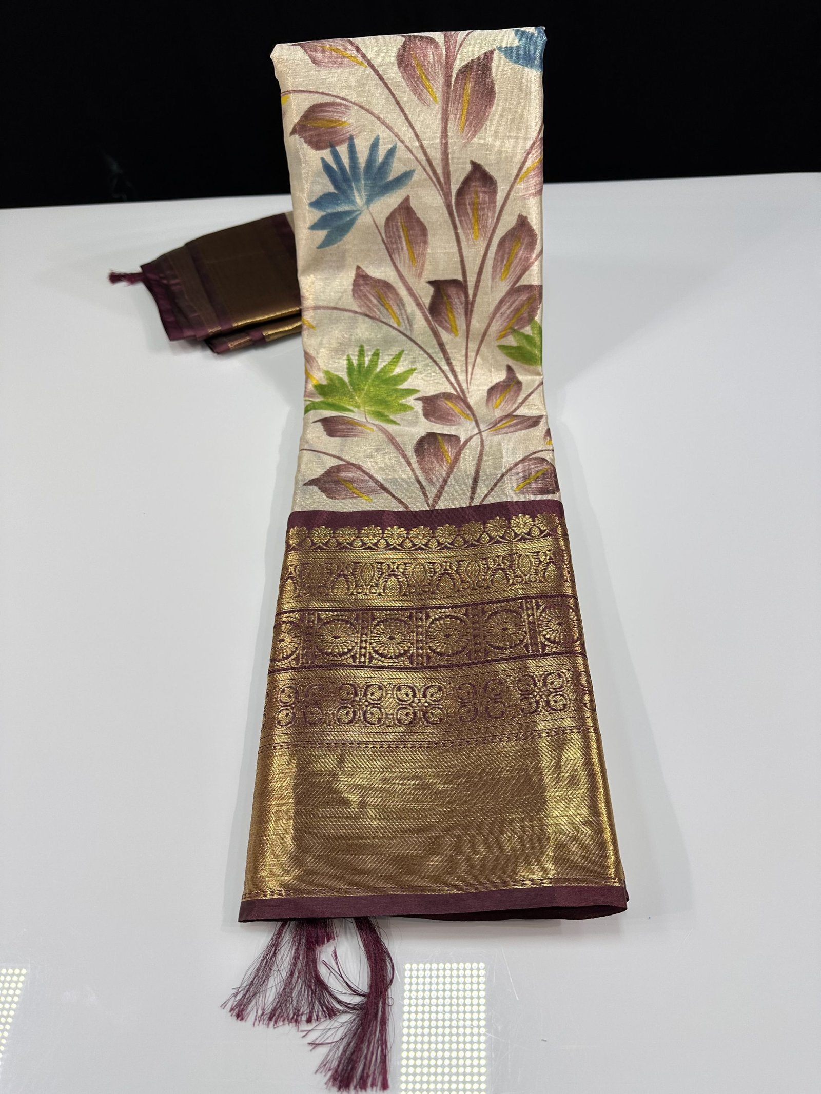 SOFT BANARASI TISSUE SILK SAREE WITHHND PINTED FLORAL JAAL ALLOVER SAREE HAVING CONTRAST WEAVING KANCHI BORDER
