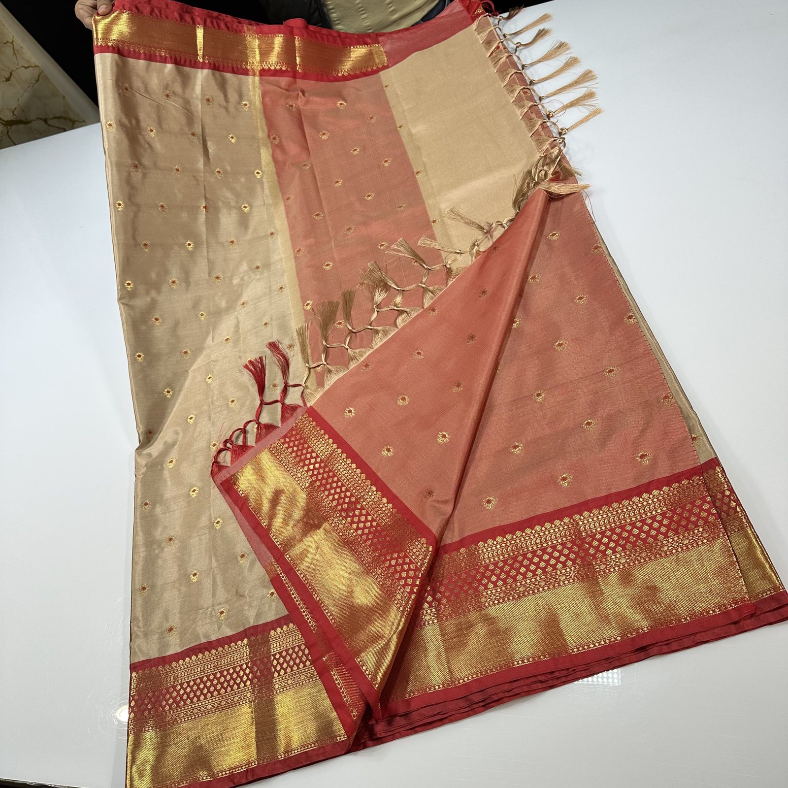 This soft Banarasi semi-silk saree is a beautiful blend of comfort and tradition, crafted with an exceptionally smooth and lightweight texture that drapes effortlessly. The body of the saree is adorned with delicate traditional zari-woven booties, each booti enriched with fine Meena work done in resham, adding subtle color highlights that bring the design to life. The interplay of shimmering zari and soft resham Meena creates a graceful, timeless charm across the saree.